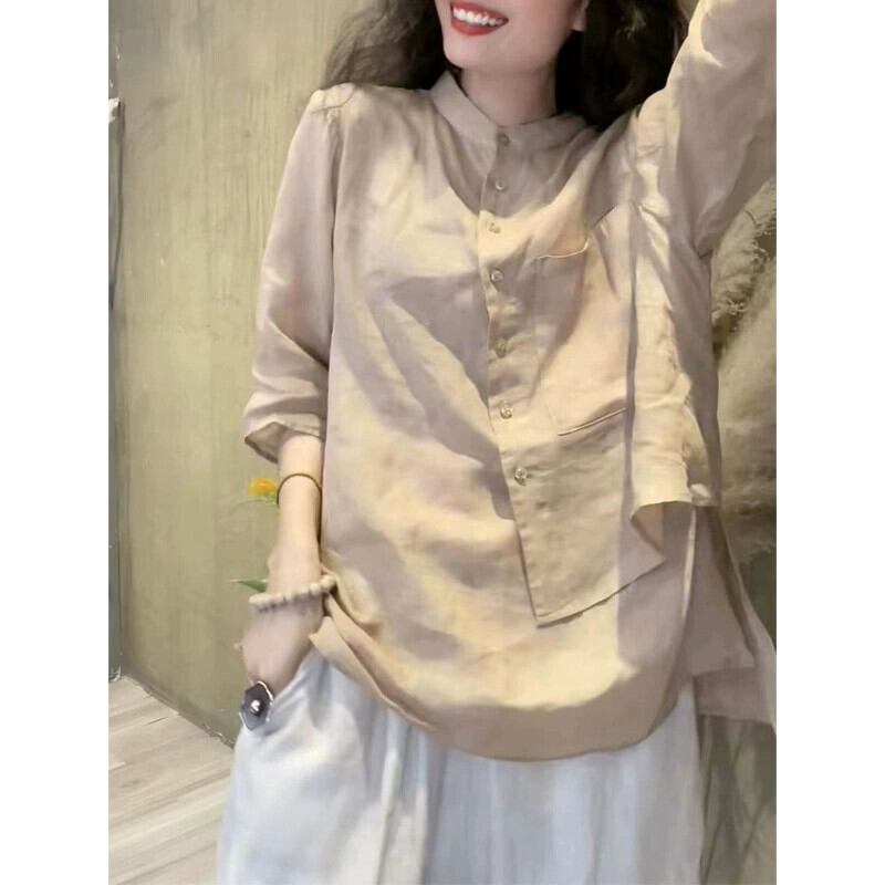 ディスカウントストアの有名カウンター引き出しクリアランスフェミニンリネントップルーズレトロコットンとリネンの七分袖シャツ夏 サマー 夏物 sine94719728371