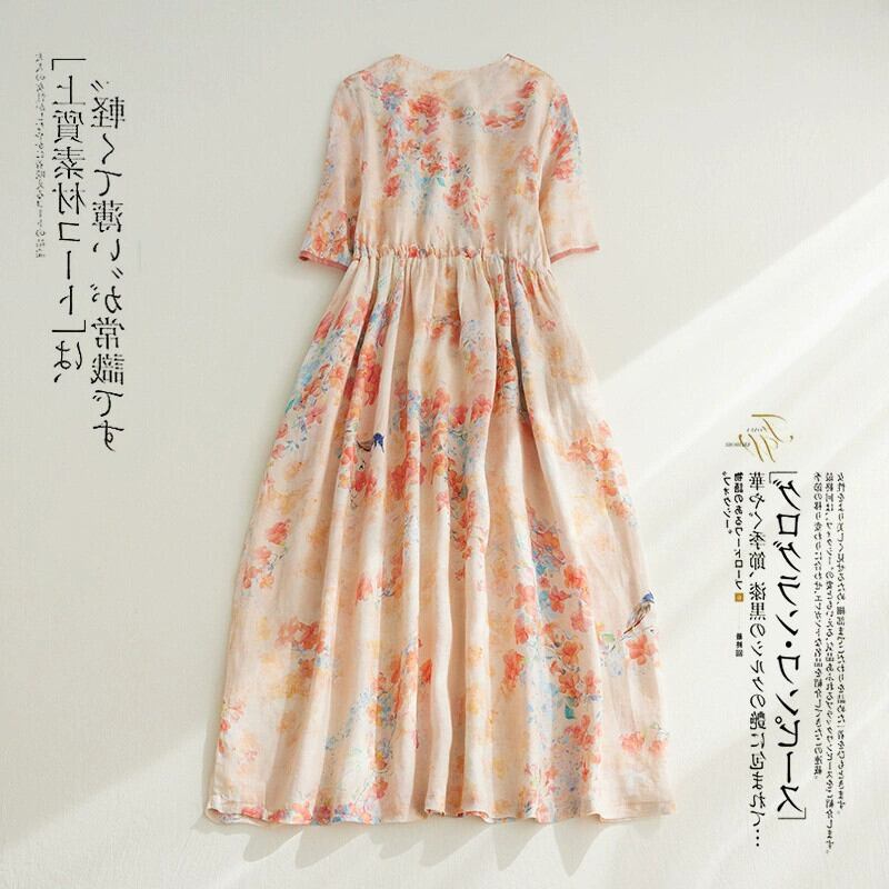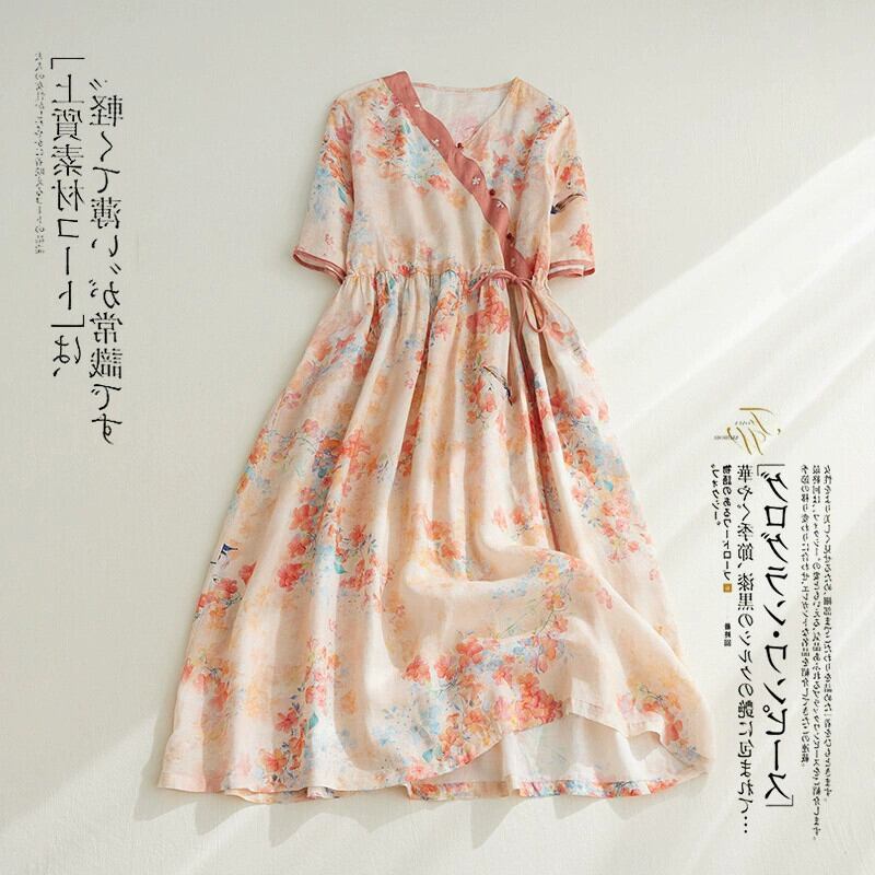 クリアランスエンドシングルレディースレトロ刺繍リネンロングスカートカジュアルプリント V ネックコットンとリネンのドレス レッド Vネック sine94307124910