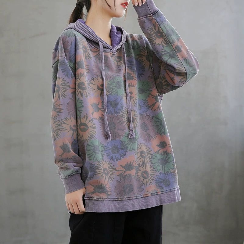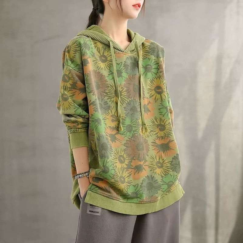 ディスカウントストアショッピングモールの女性のレトロプリントフード付きスウェットシャツ秋と冬ルーズ痩身長袖トップジャケット ロング オータム 秋物 ウィンター 冬物 sine35673720836