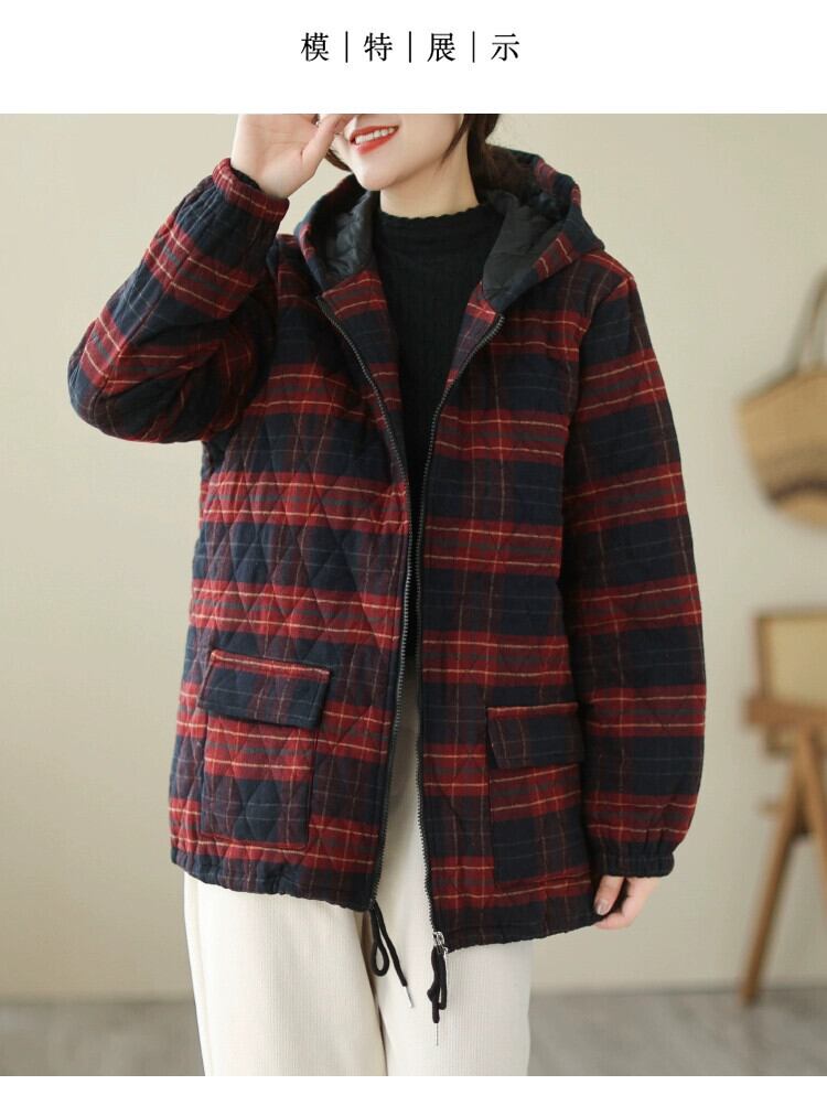 ディスカウントストアショッピングモールの女性のキルティングチェック柄フード付きコットンコートルーズジッパー肥厚暖かいコットンコート sine85118107626