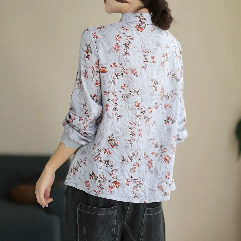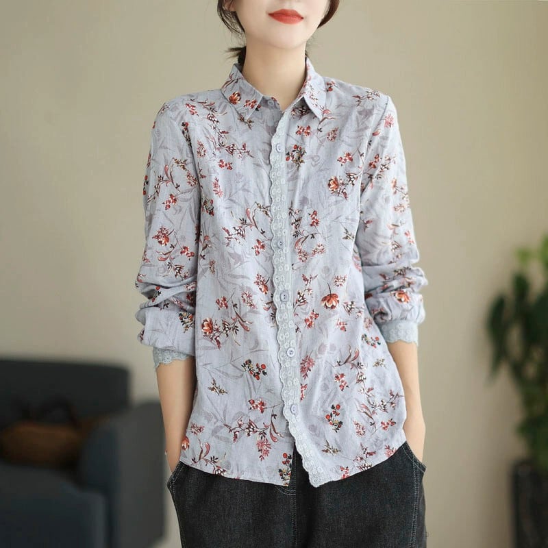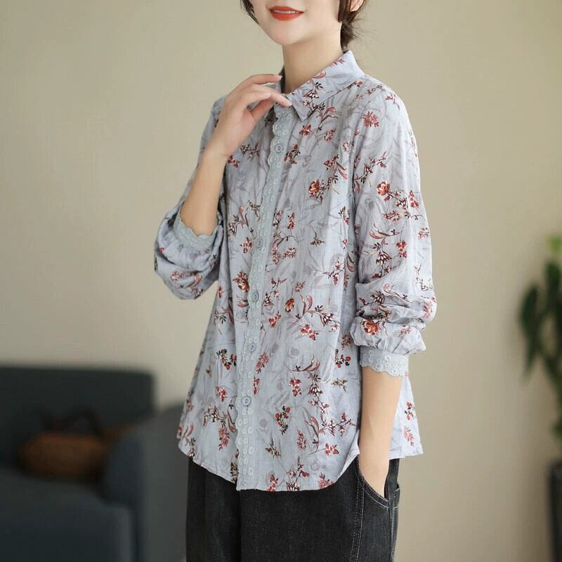 カウンタークリアランスクリアランスレディースフローラルレースコットンとリネンシャツルーズラペルリネン長袖トップ ロング 花柄 sine78202703334