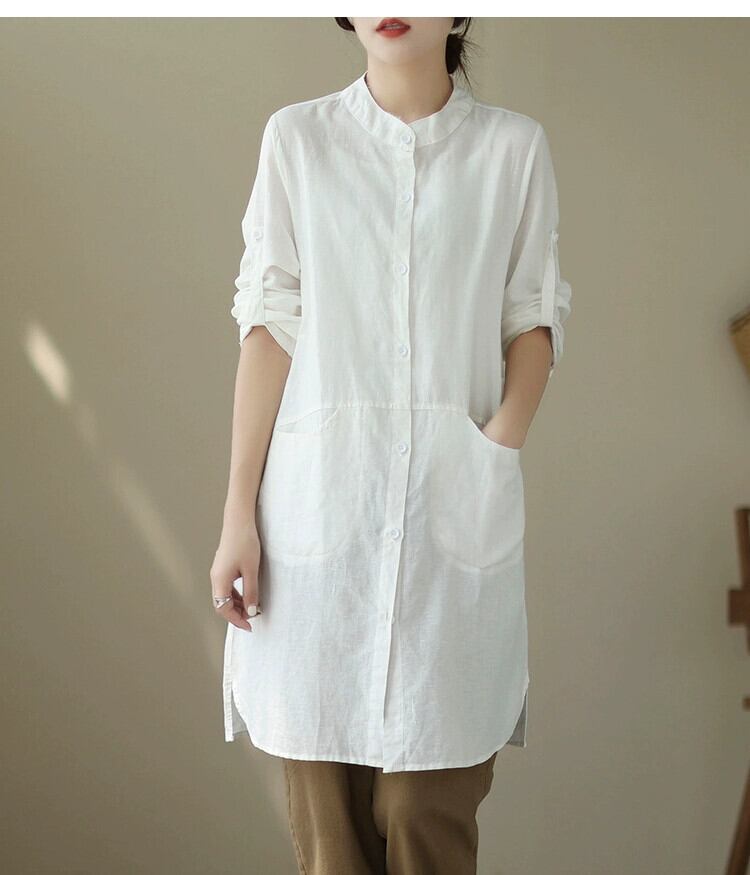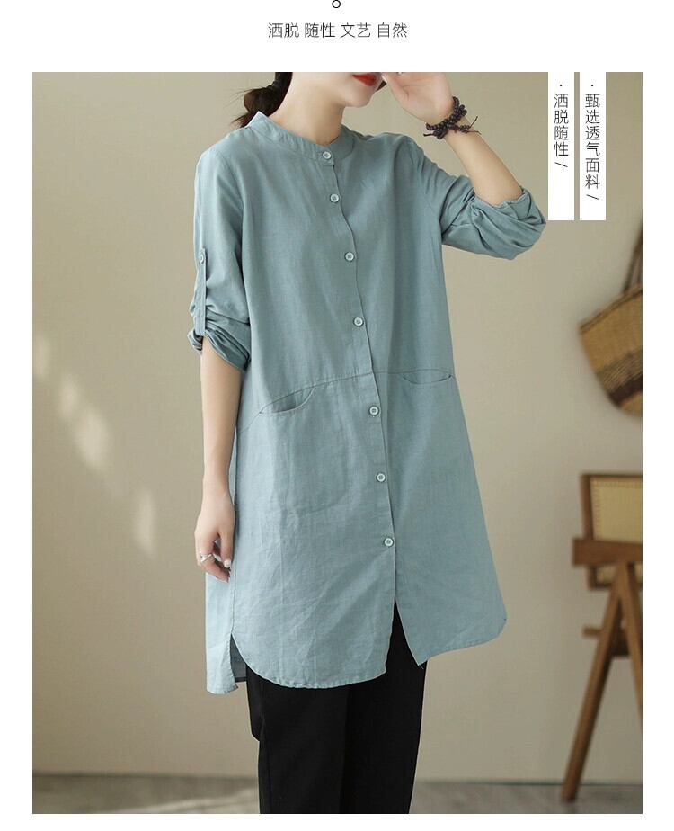 クリアランスリーク〜既製のレディースカジュアルスタンドカラーミッドレングスリネントップ秋のゆったりとしたコットンとリネンの長袖シャツ ロング オータム 秋物 sine26787596803