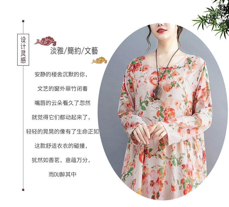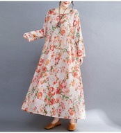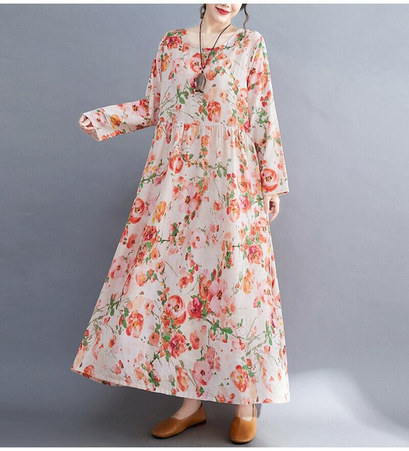 ディスカウントストアカウンタークリアランスレディースエスニック風花柄長袖ラミーワンピースゆったり綿麻フルスイングドレス ロング コットン sine2170642676