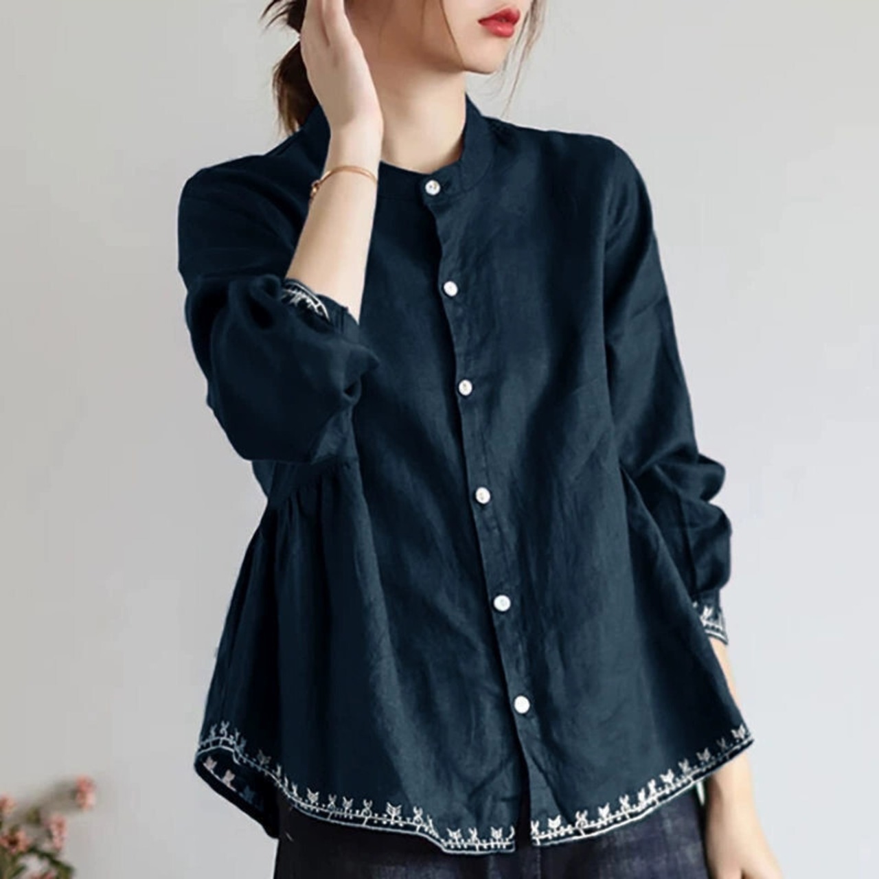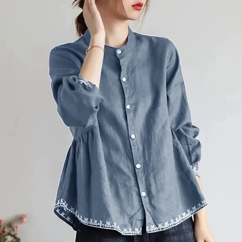 クリアランスカウンター最後の在庫レディースレトロスタンドアップカラードールトップルーズスリミングコットンとリネン長袖シャツ ロング sine76578690898