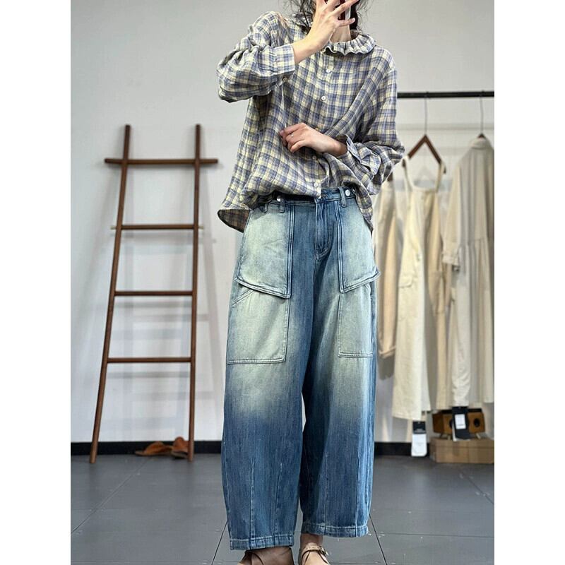 クリアランスブランド牛グッズカウンター最終在庫レディース香港スタイルリネンベビートップルーズ長袖コットンとリネンチェック柄シャツ ロング sine50802847351