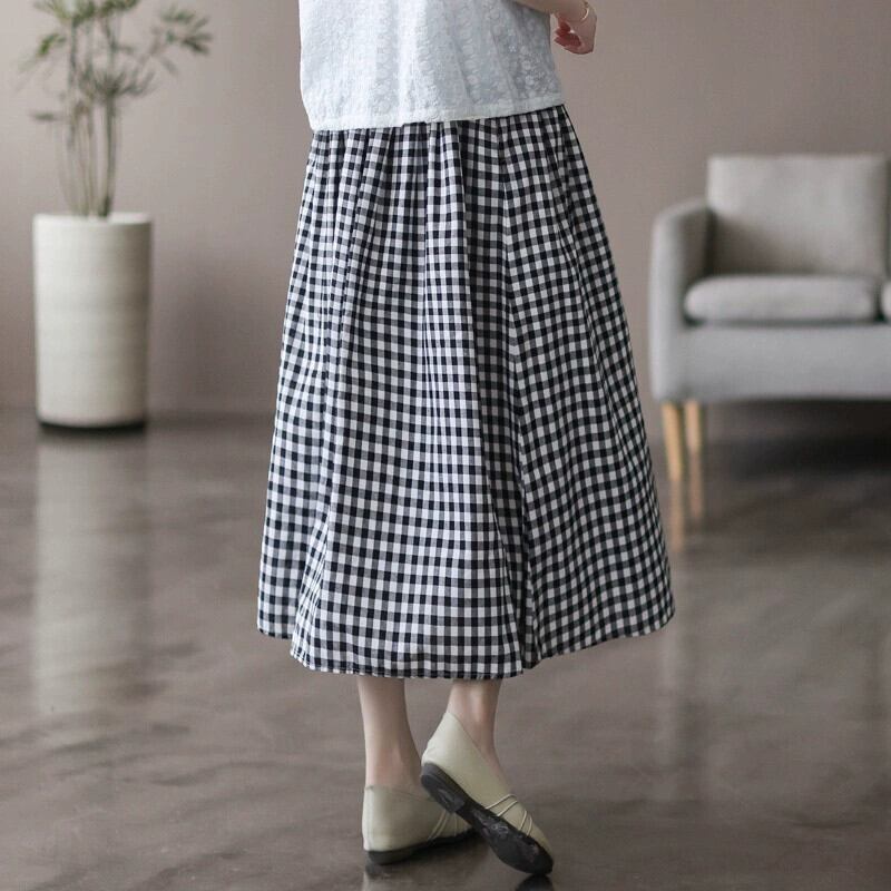 永貿易輸出ビッグブランド尾品撤退レディース ese チェック柄リネンスカートカジュアル弾性ウエスト綿とリネン A ラインスカート コットン エラスティック 伸縮 Aライン sine92354390112