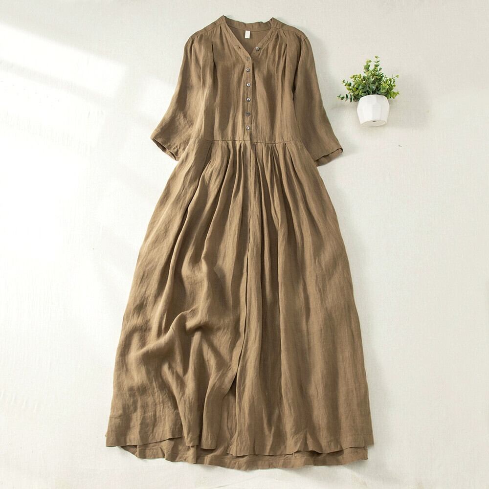 クリアランスリーク〜eseオリジナルシングルコットンリネンドレスレディース、レトロVネックハイウエスト、大きな裾、半袖、リネンAラインロングスカート ハイウェスト ショート ハーフスリーブ sine56803335215