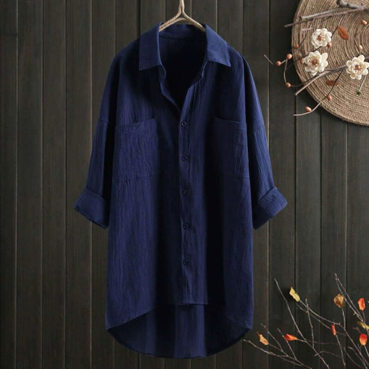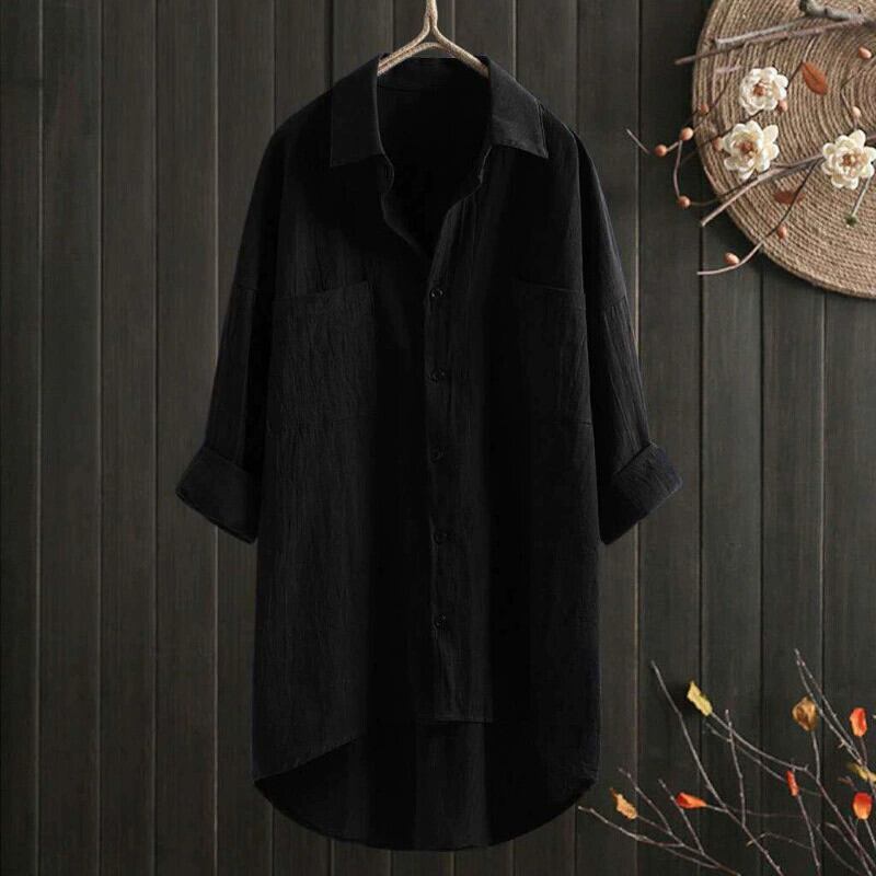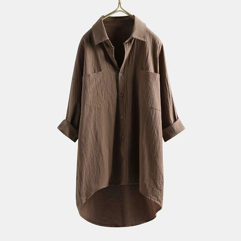 クリアランス漏れ ~ 女性用無地のコットンとリネンのラペル シャツ、ゆったりとしたカジュアルなリネンの長袖シャツ、カウンターからのトップス ロング ソリッドカラー sine51176806172