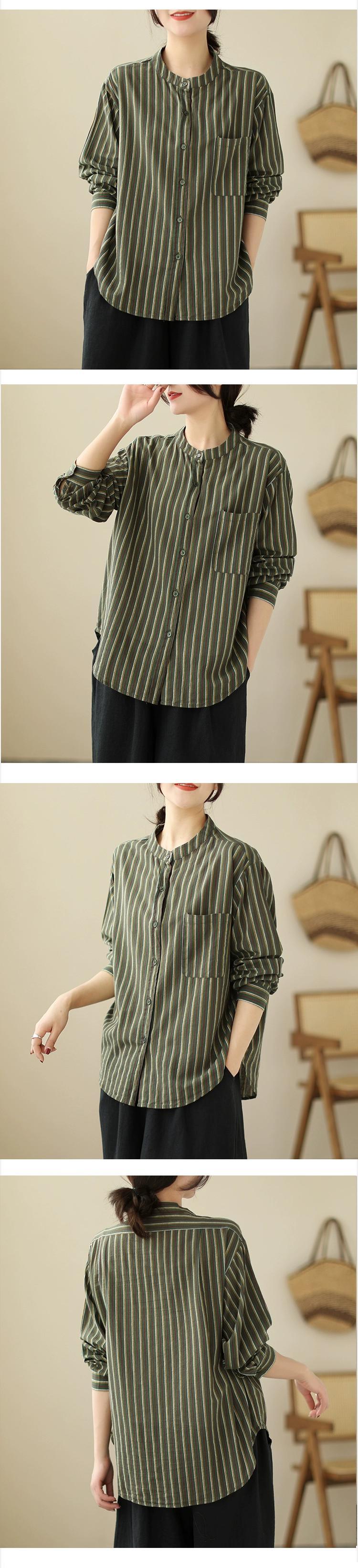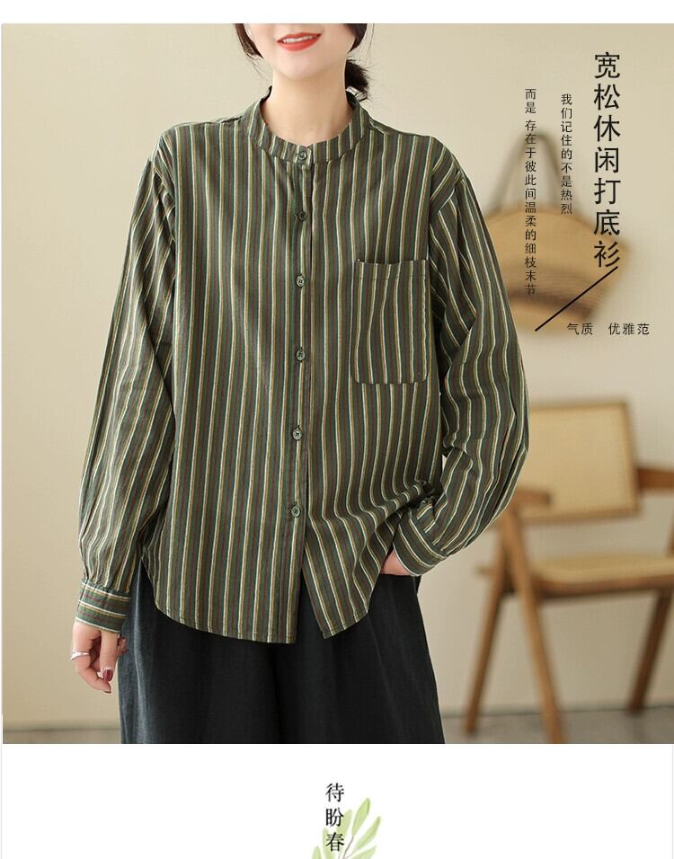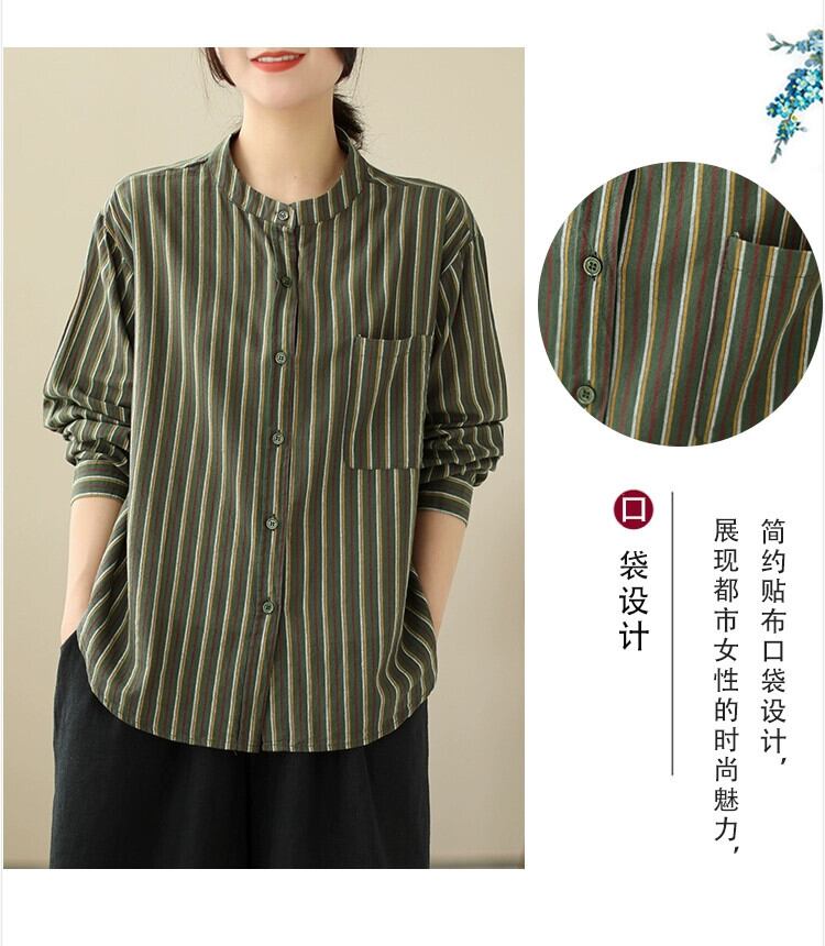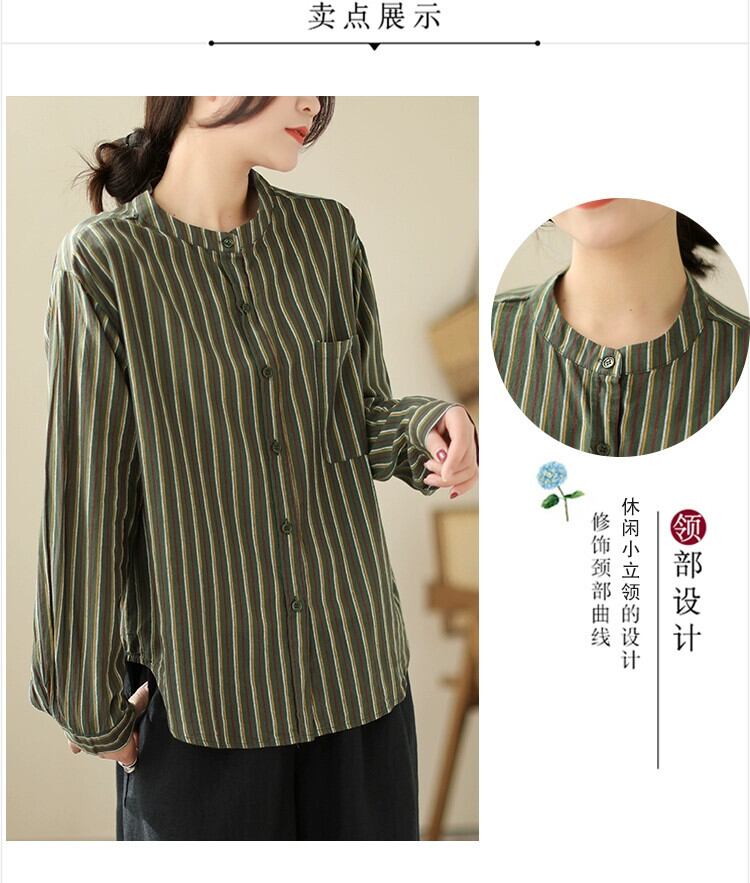 Eign Trade Export Big Tail Goods 撤退レトロストライプリネンシャツレディースルーズスタンドカラーコットンとリネンシングルブレストトップ sine28566581489