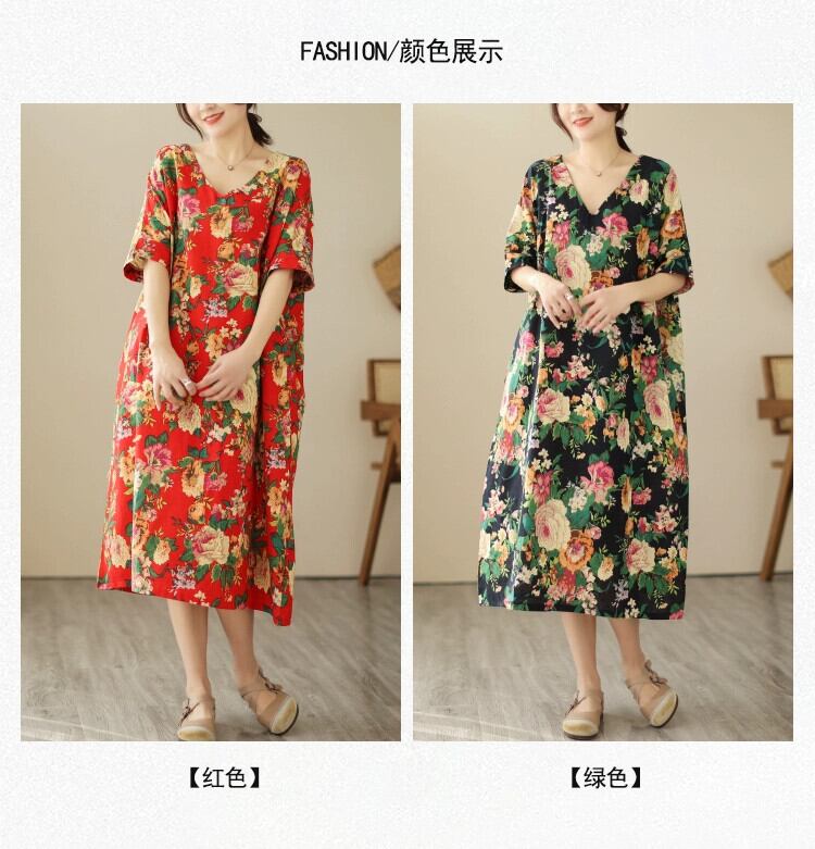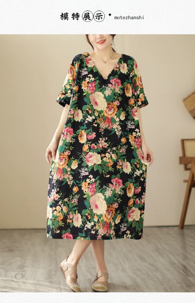 クリアランスブランド牛グッズカウンター最終在庫レディースエスニック風プリント半袖ワンピースゆったり大きいサイズ綿麻ミモレ丈スカート コットン 大きめサイズ sine36670992799