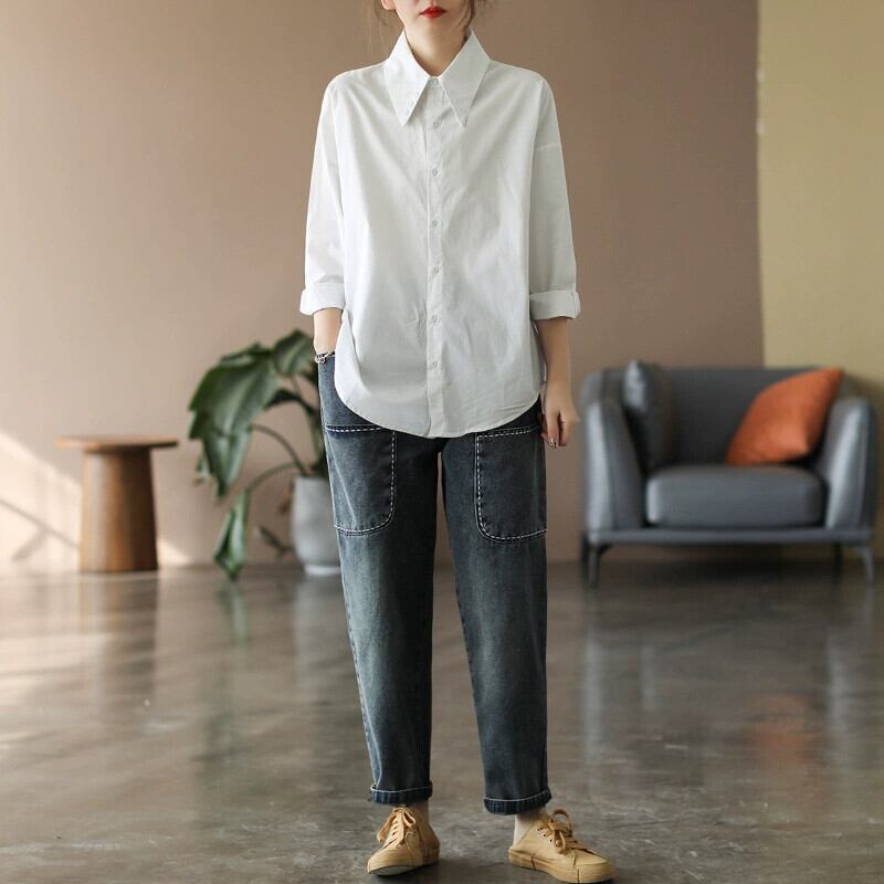 カウンタークリアランスグッズ シンプルで万能なポイントカラーシャツ ゆったり着痩せ コットンとリネンのレディースシャツトップス sine53560781484