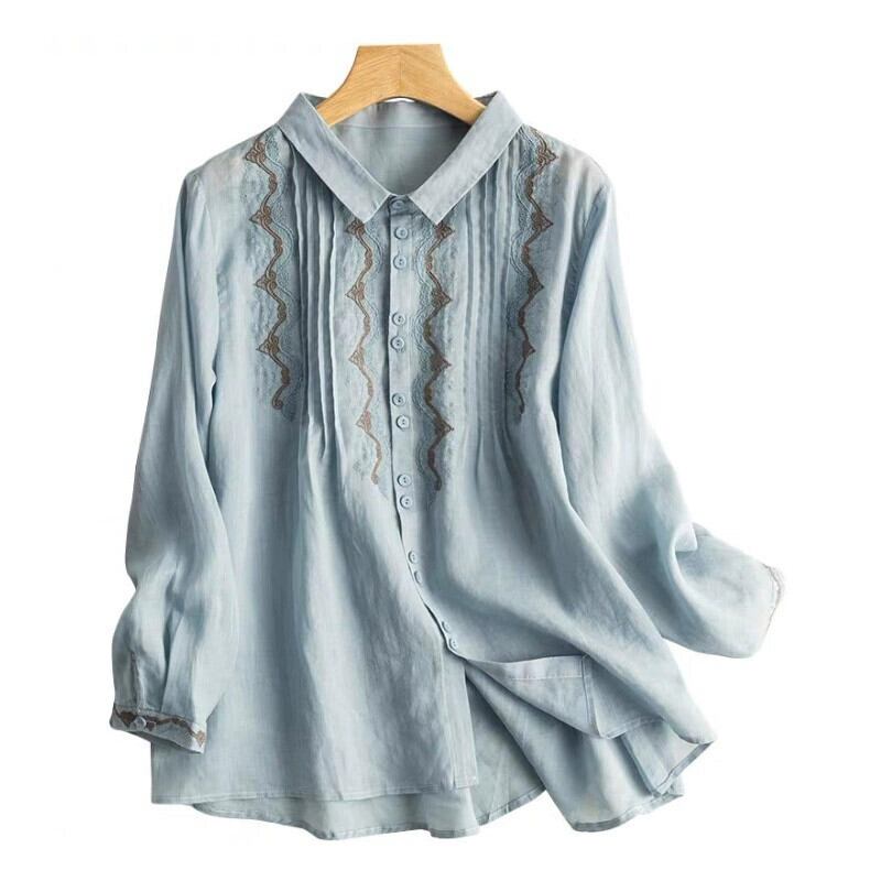有名な既製の女性用レトロ刺繍入りラミーラペル シャツ ルーズ コットンとリネンのシングルブレスト トップをクリアランス カウンターで撤去 レッド sine86441320074