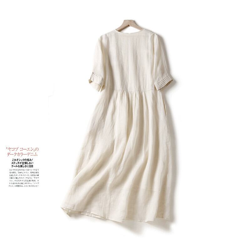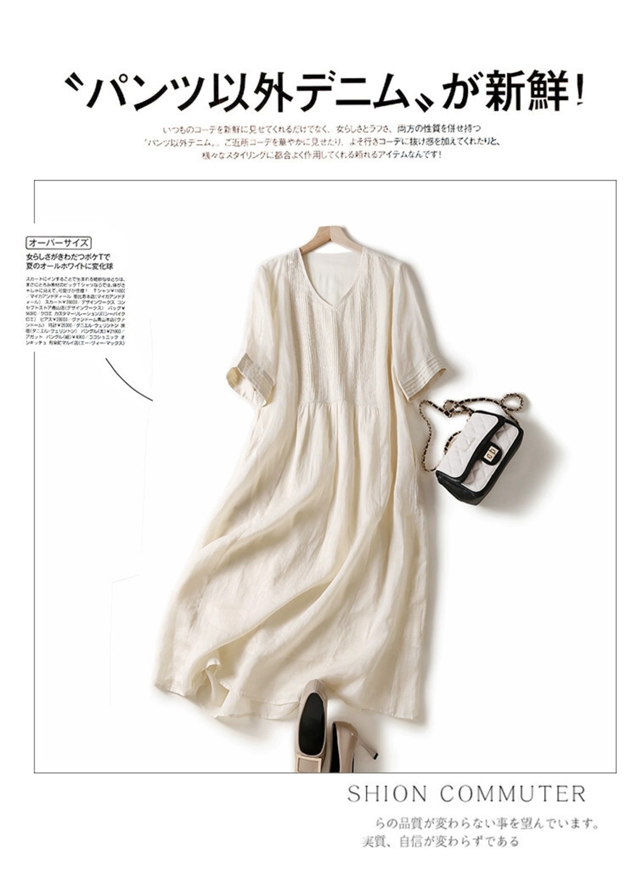 eign trade ese オリジナルハイエンドブランド女性エストラミードレス V ネックアコーディオンプリーツ綿とリネン半袖ミモレ丈スカート コットン Vネック sine73801568247