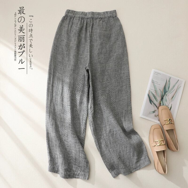 クリアランス漏れ ~ カウンターからの最後の在庫 ese スタイル千鳥格子リネン ワイドレッグ パンツ レディース 夏 ルーズ レースアップ コットンとリネン カジュアル パンツ サマー 夏物 sine36610995792