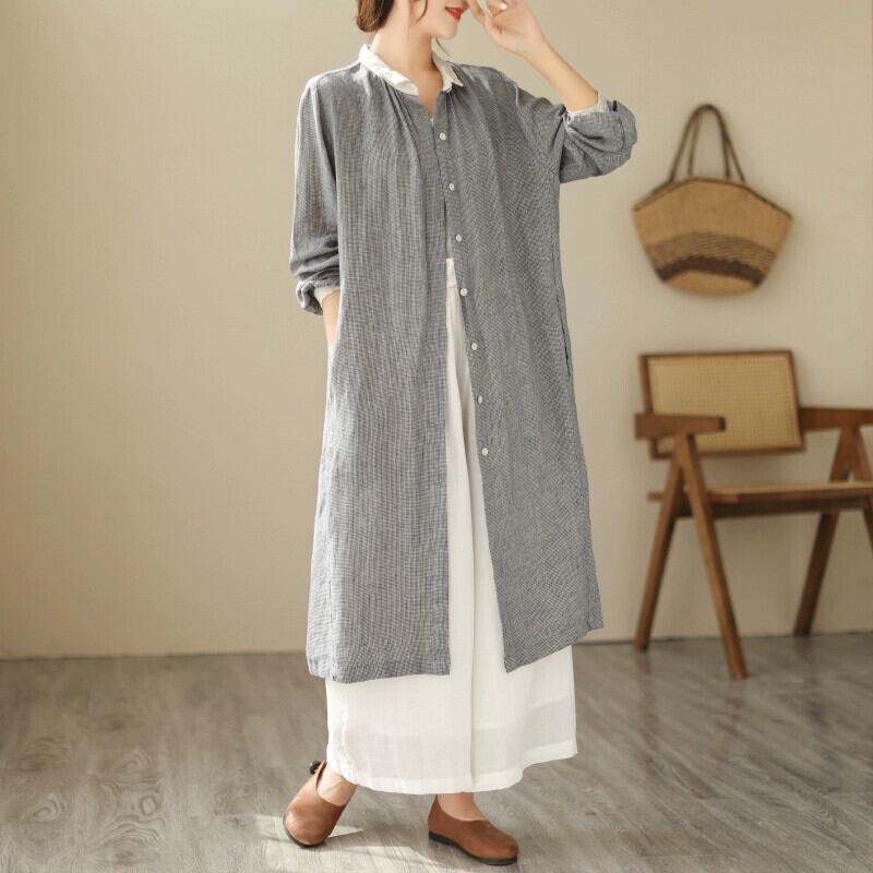 カウンター取り外しクリアランス最後の在庫レディースレトロ千鳥格子リネンシャツスカートルーズミッドレングスコットンとリネントップ sine89561458574