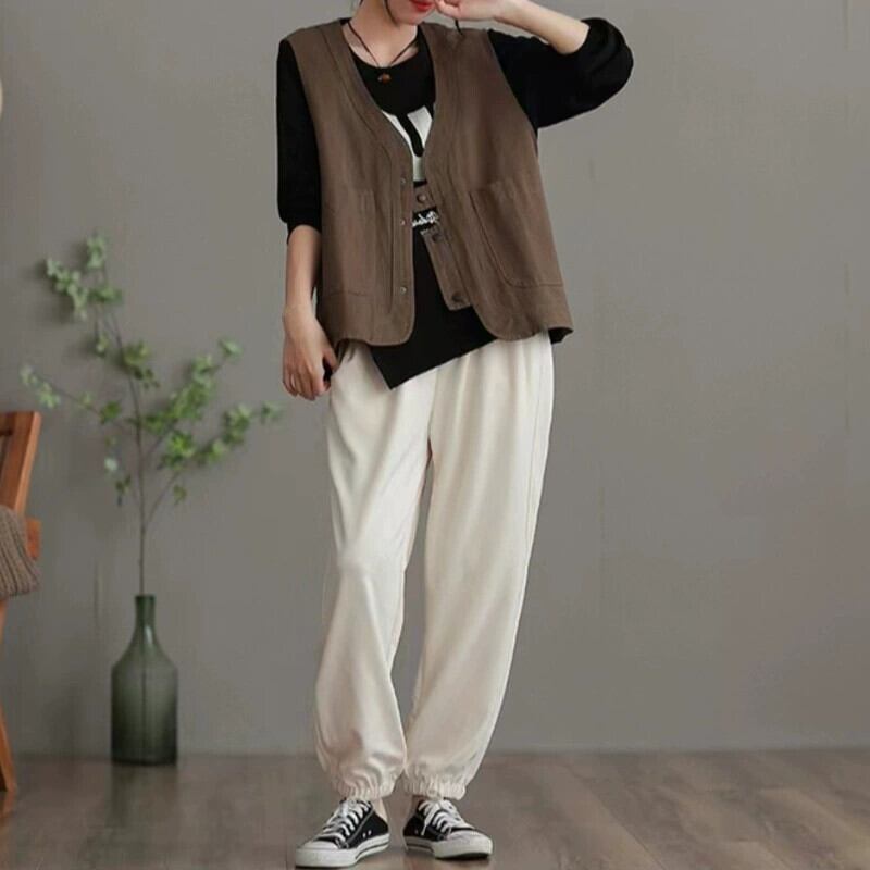 ディスカウント ストア ショッピング モールの女性のレトロな綿とリネンのチョッキ ジャケット ルーズ V ネック ベスト トップ コットン Vネック sine16402718754