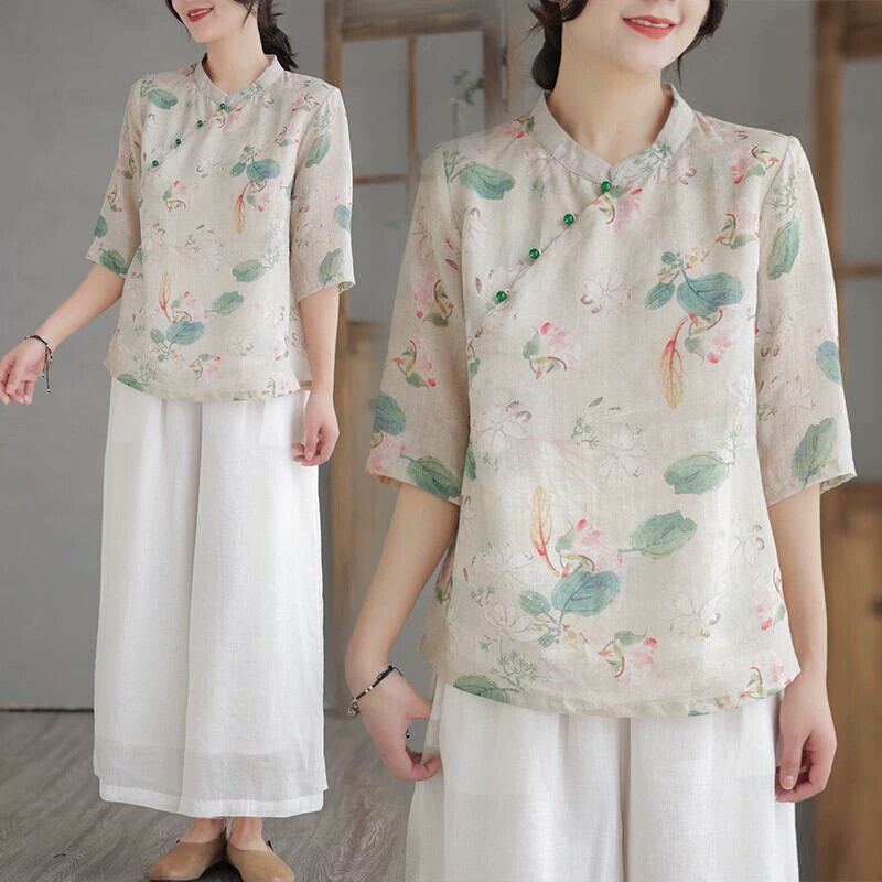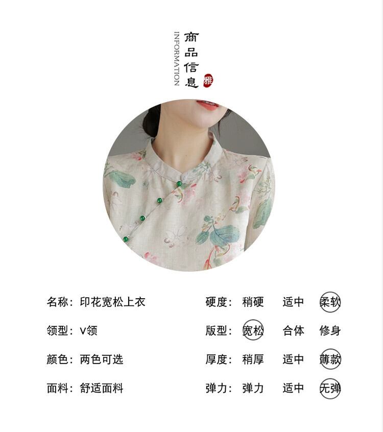 ディスカウントストアショッピングモールの女性の中国風の斜めラペルラミーティーシャツレトロプリントコットンとリネン半袖トップ sine37402066092