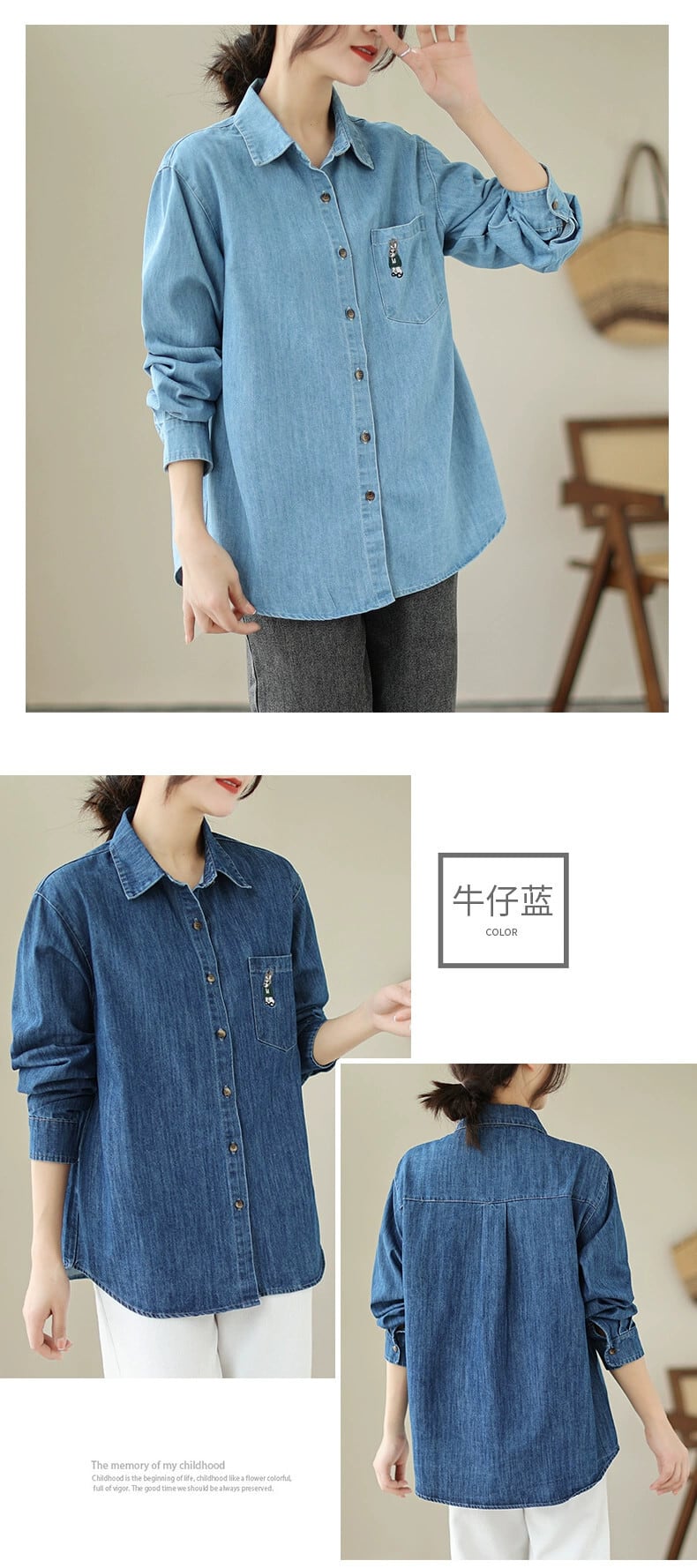 Eign Trade Counter ブランド テール グッズ レディース ダメージ加工 ウォッシュド デニム 長袖シャツ ルーズ ソリッド カラー 多用途 シングルブレスト トップ ロング ソリッドカラー sine13618122078