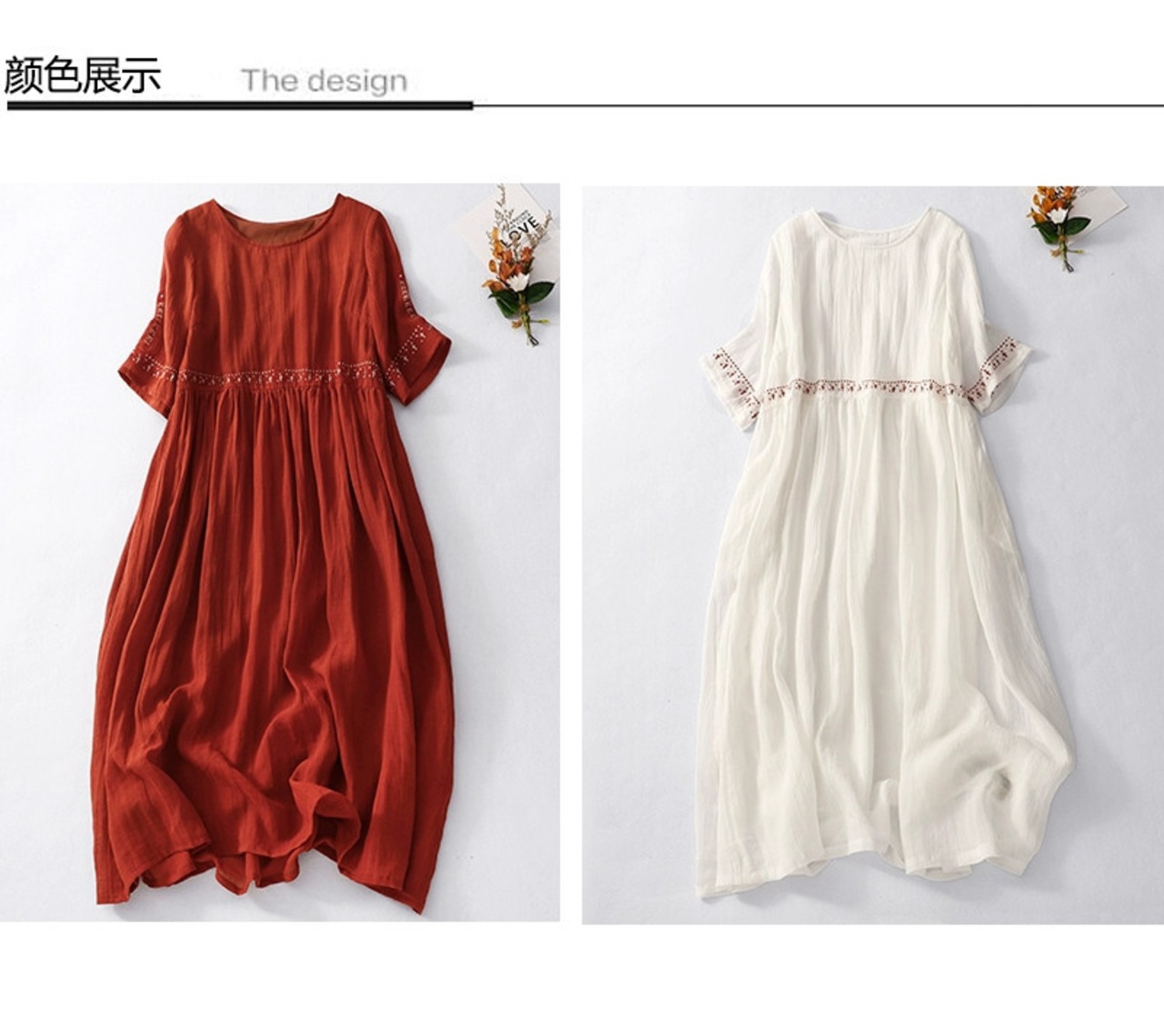 永貿易輸出ビッグブランドテール商品撤退女性の綿とリネン刺繍半袖ドレスルーズプルオーバーリネンスカート大きな裾 レッド コットン sine82800321732