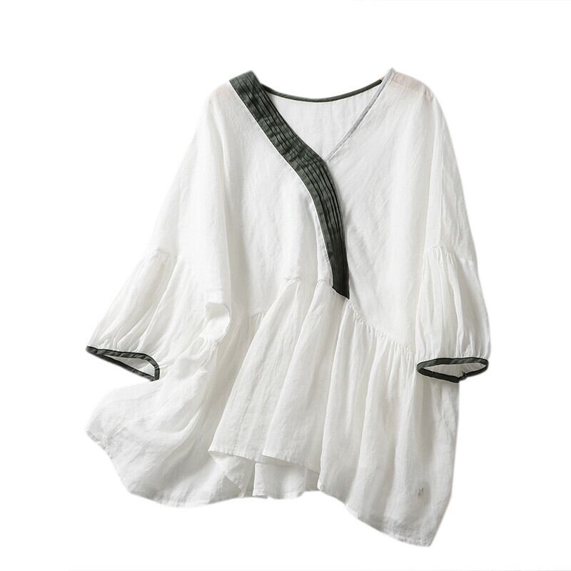 eign trade ese オリジナルハイエンドブランド女性森 V ネックラミー半袖シャツルーズリネンドールトップ Vネック sine64164114293
