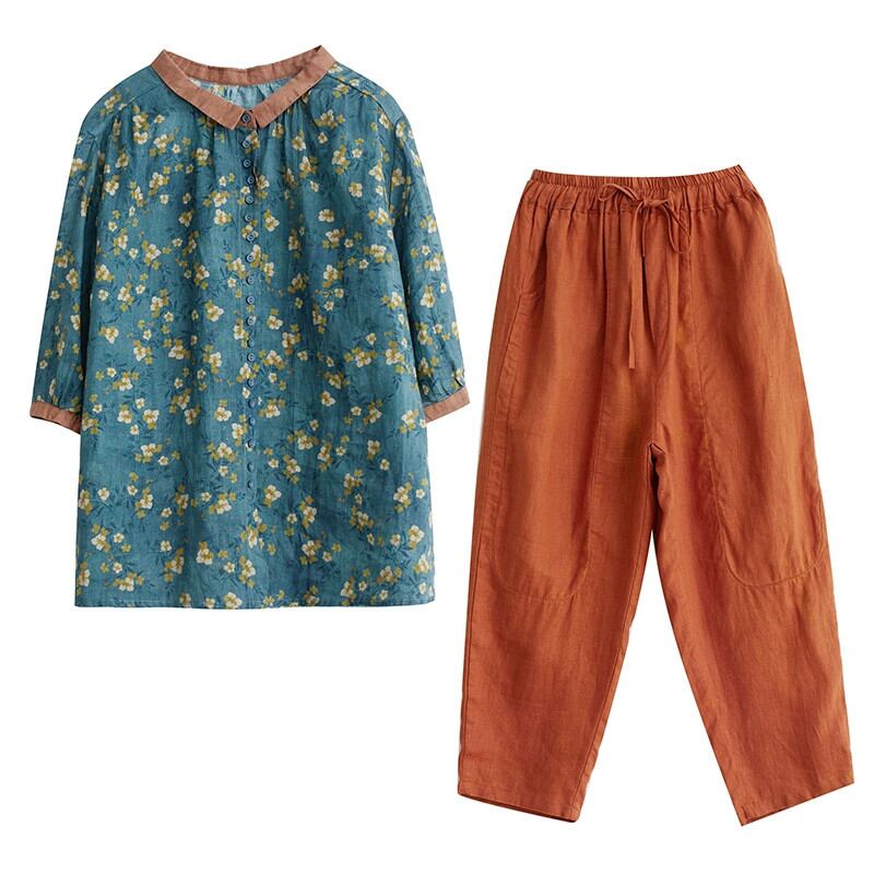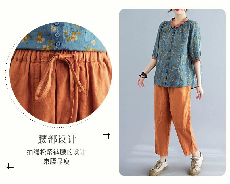 Eign Trade Counter ブランドテールグッズ綿とリネンのスーツの女性の花柄半袖トップカジュアル 9 点パンツリネン 2 ピース夏セット コットン サマー 夏物 sine58205706894