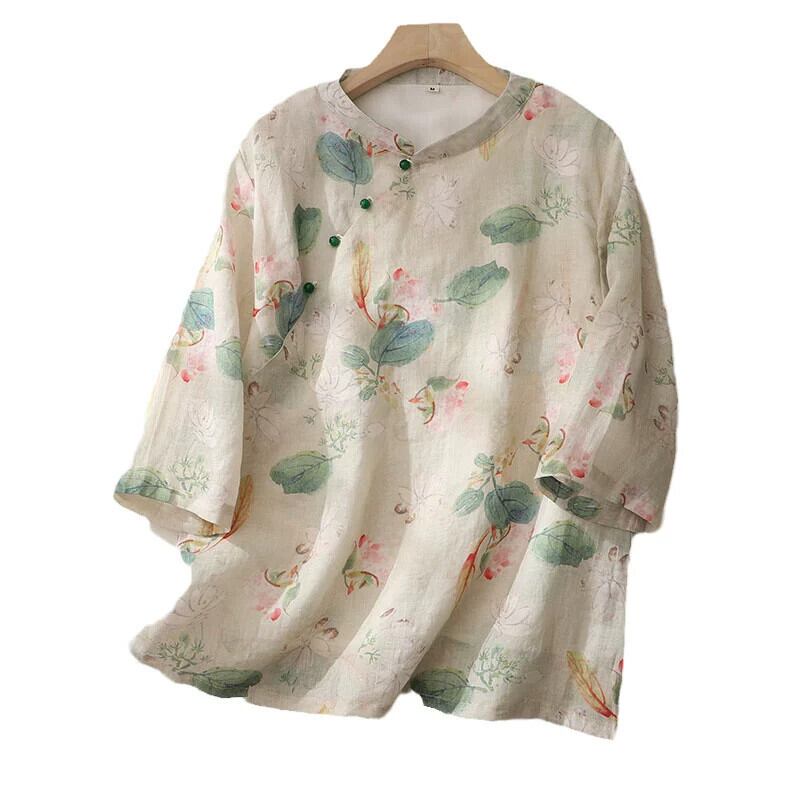 ディスカウント ストア ショッピング モールの女性の中国風スラント ラペル ラミー ティー トップ薄いルーズ綿とリネン半袖シャツ コットン sine61550637565