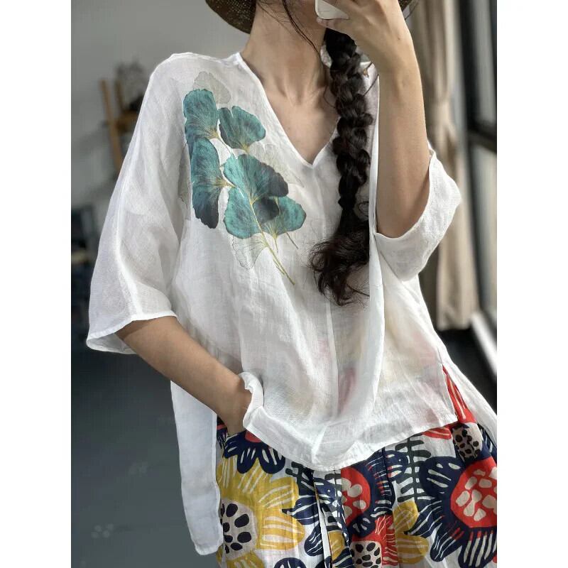 クリアランスリーク〜eseオリジナルレトロプリントラミーVネックトップTシャツレディースルーズ七分袖コットンリネンシャツ sine61305754392