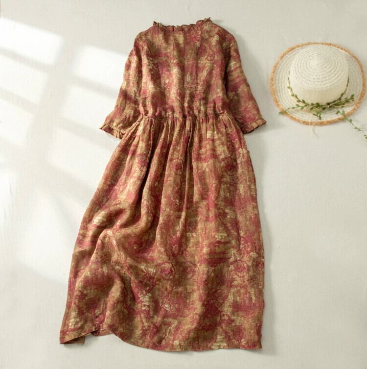 有名ブランドの在庫切れレディース リネン半袖ドレス レトロ プリント コットンとリネンの大きな裾のミモレ丈スカートのクリアランス カウンターの削除 sine75543777913