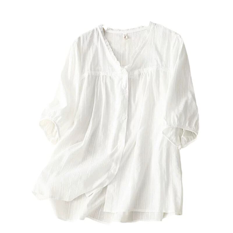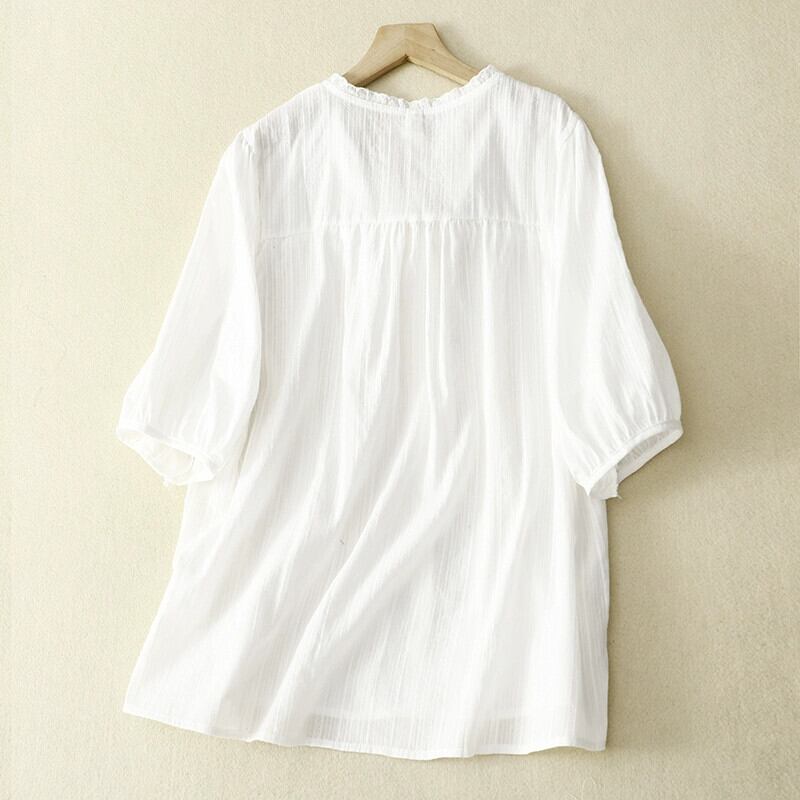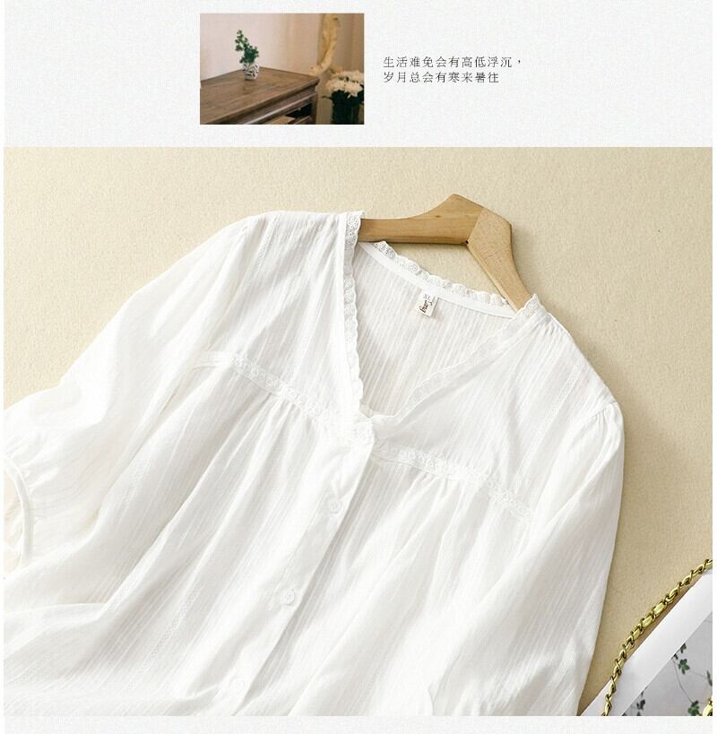永貿易輸出ビッグブランドテールグッズ撤退白綿半袖シャツ女性の夏薄い V ネックシングルブレストトップ ホワイト コットン サマー 夏物 Vネック sine12361726896