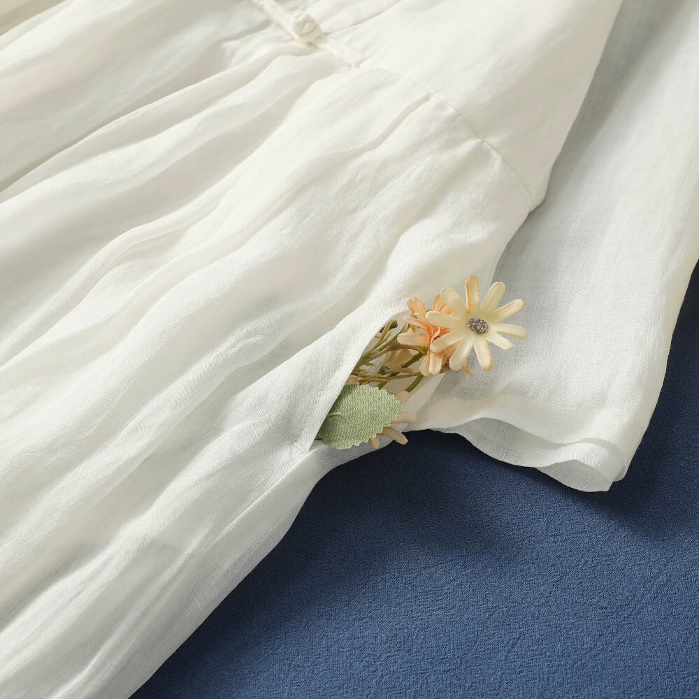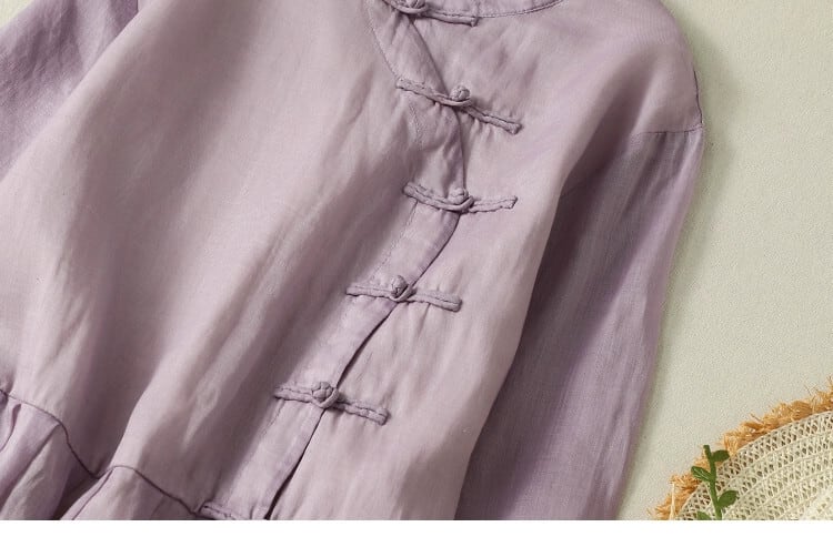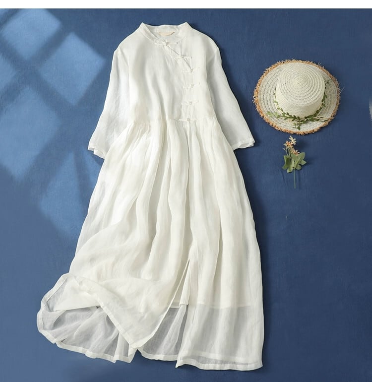 漏れを拾う〜カウンターから削除、斜めの前立てとバックルが付いたラミーのドレス、エレガントなスタンドアップカラー、裾が広いエレガントな半袖のコットンとリネンのロングスカート sine11422600070