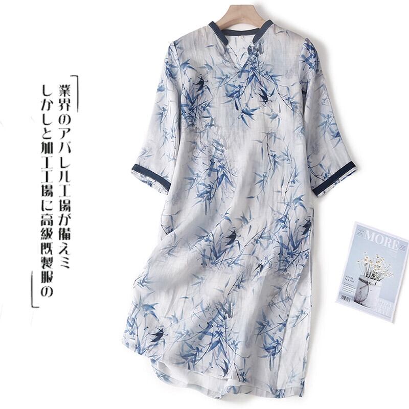 永貿易輸出大ブランド尾品撤退女性の中国風禅プリントドレスルーズ半袖コットンとリネンのミドル丈スカート sine98238238319