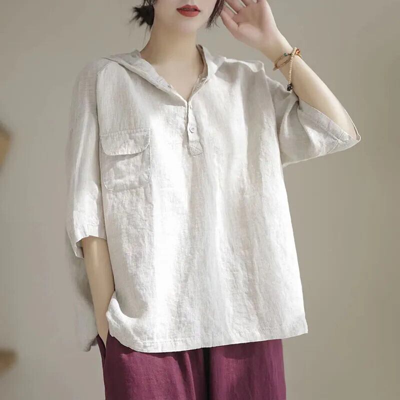 eign trade ese オリジナルビッグブランド撤退大きいサイズ綿とリネン半袖 Tシャツレディースルーズリネンフード付き Tシャツトップ コットン 大きめサイズ sine71856014189