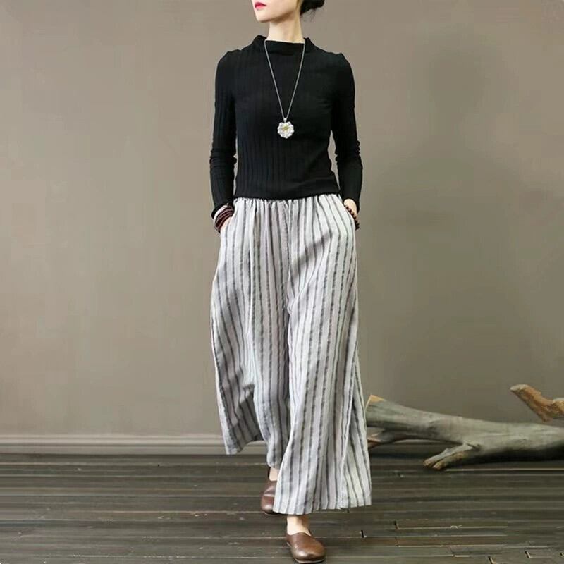 クリアランスリーク~eseオリジナルファッション縦縞綿と麻のカジュアル9点パンツの女性、ゆったりとしたリネンのワイドレッグパンツ、細いスタイル コットン ストライプ sine88975119324