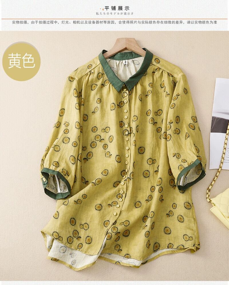カウンター削除クリアランス最後の在庫レディースレトロプリントコットンとリネンシャツトップルーズリネン七分袖シャツ sine23070302138