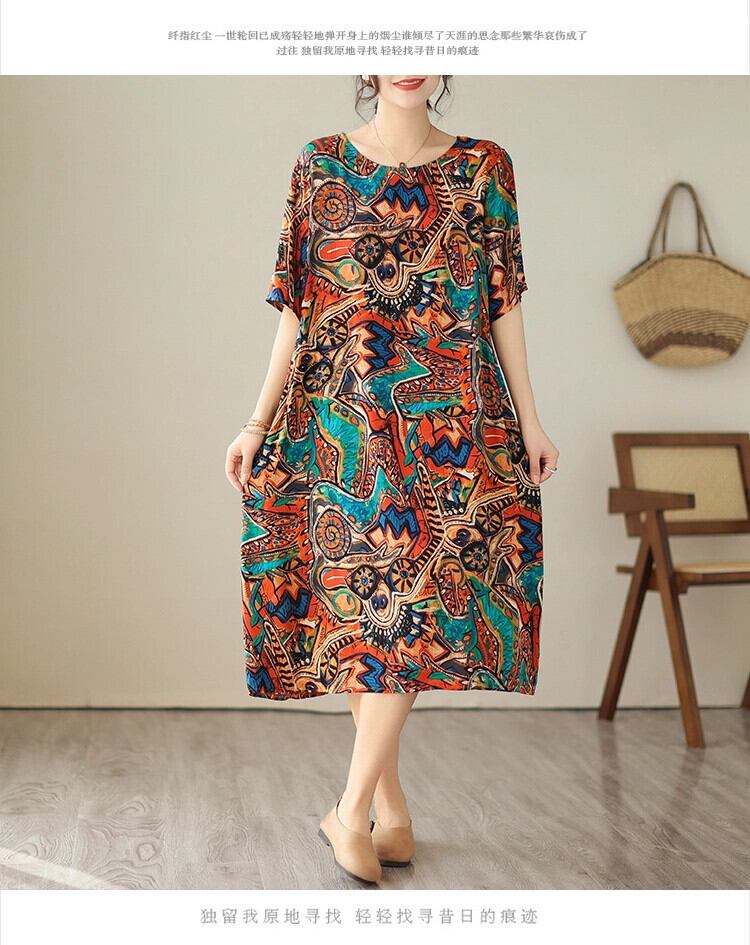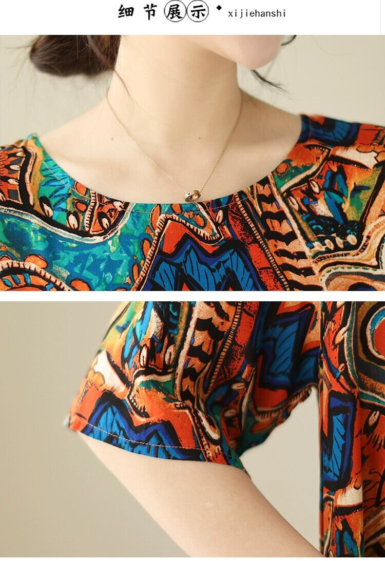 ディスカウントストアショッピングモール撤退女性のエスニックスタイルプリントコットンとリネンドレスルーズスリミングラウンドネックリネンロングスカート Oネック sine41620495037