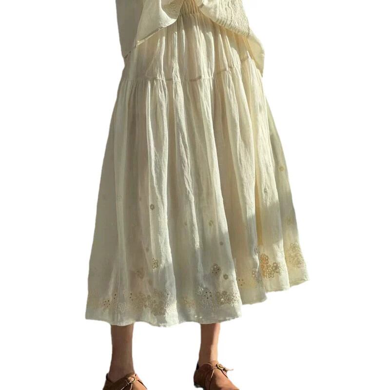 クリアランスブランド牛グッズカウンター最終在庫レディースレトロ刺繍綿麻スカートルーズプリーツリネンAラインロングスカート レッド コットン sine46703651238