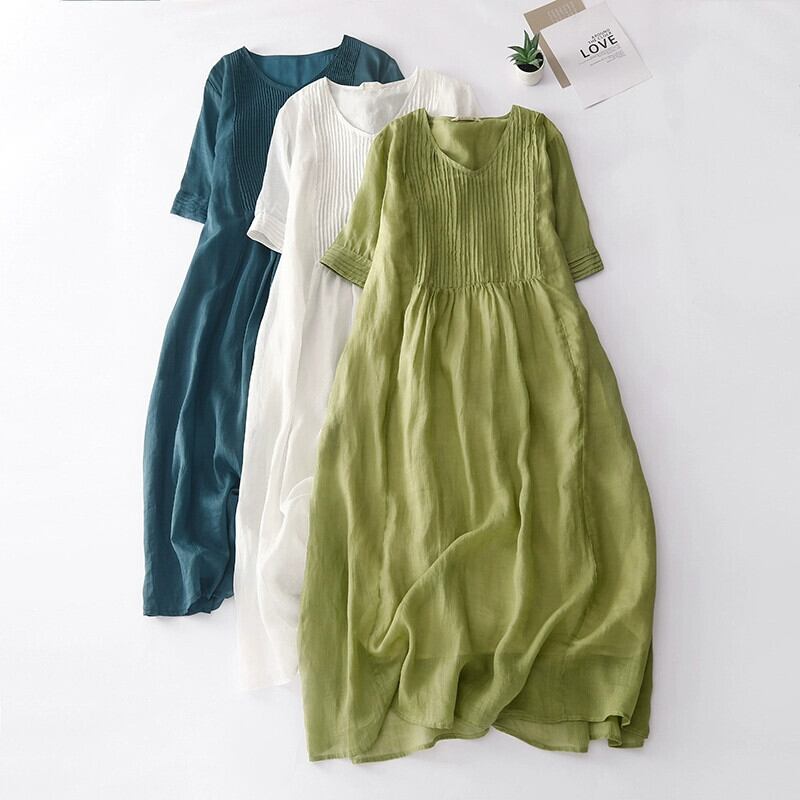 ビッグブランドテールグッズのクリアランスカウンター撤去レディースアコーディオンプリーツラミー半袖ドレスゆったりとしたコットンとリネンの大きな裾のロングスカート sine88267655999