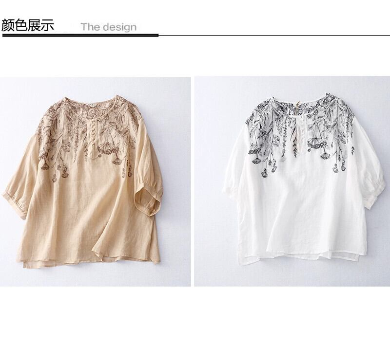 クリアランスブランド牛グッズカウンター最終在庫レトロ刺繍リネンシャツレディース夏ルーズコットンとリネン半袖シャツトップ レッド サマー 夏物 sine36454371649