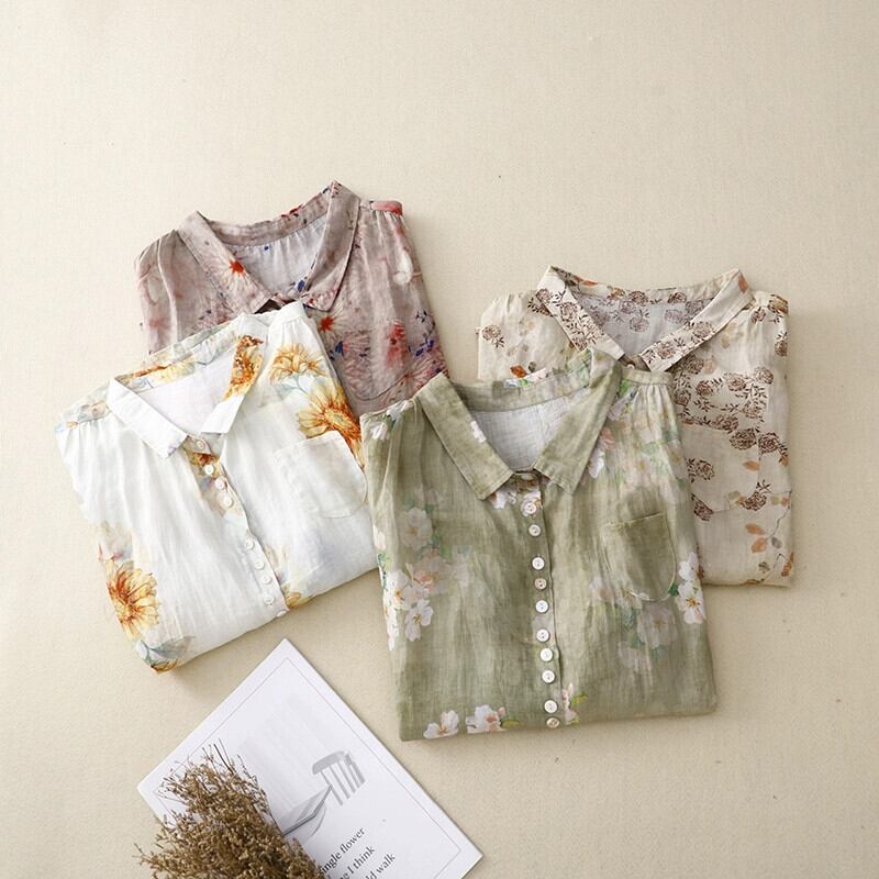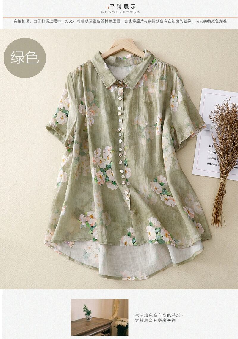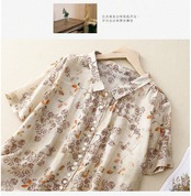 第一線ブランド eign trade 撤退最終在庫ルーズコットンとリネン半袖シャツレディースサマーリネンプリントホリデーシャツトップ 夏物 sine75284814915