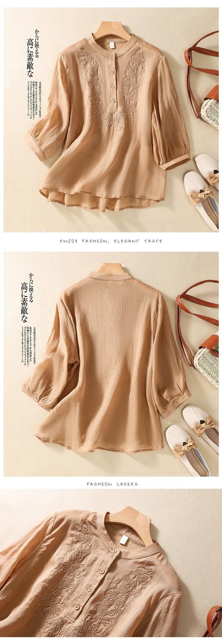 カウンタークリアランスクリアランスレディース刺繍リネン半袖シャツルーズコットンとリネンスタンドアップカラー5スリーブトップ レッド sine70534178112