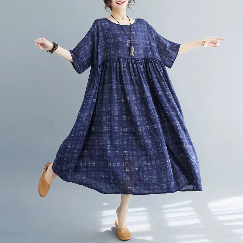 モールビッグネーム撤退最後の在庫女性のレトロチェック柄コットンとリネンのドレスルーズ大きいサイズのリネンロングスカート 大きめサイズ sine68548429488