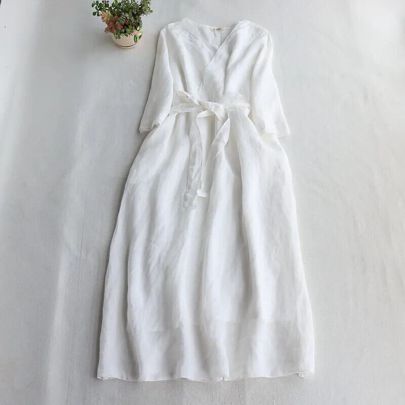 カウンタークリアランス最後の在庫レディースコットンとリネンホワイトドレスルーズレースアップVネックリネンAラインミドル丈スカート sine99562150180