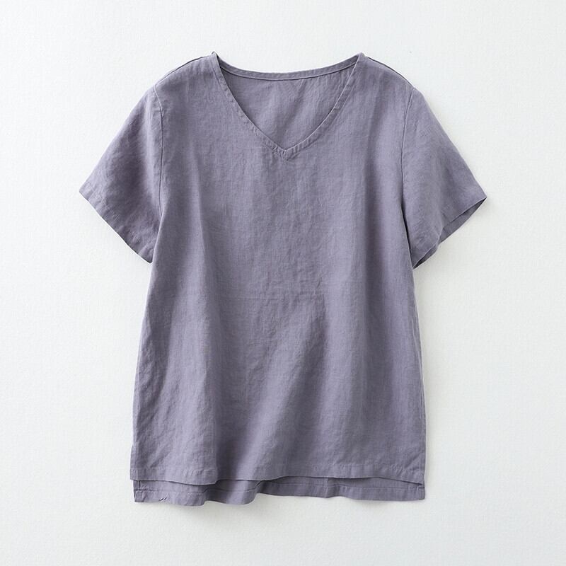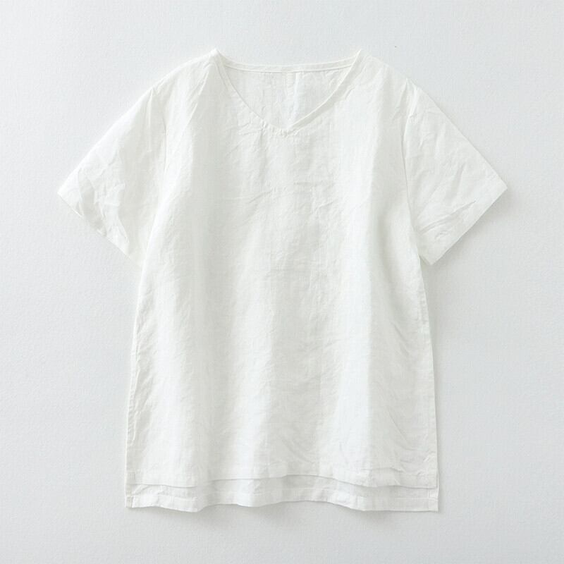 ディスカウントストアショッピングモールレディースポリコットンリネンVネック半袖Tシャツレディースソリッドカラー万能リネンラウンドネックトップ薄手 Oネック sine73470879095