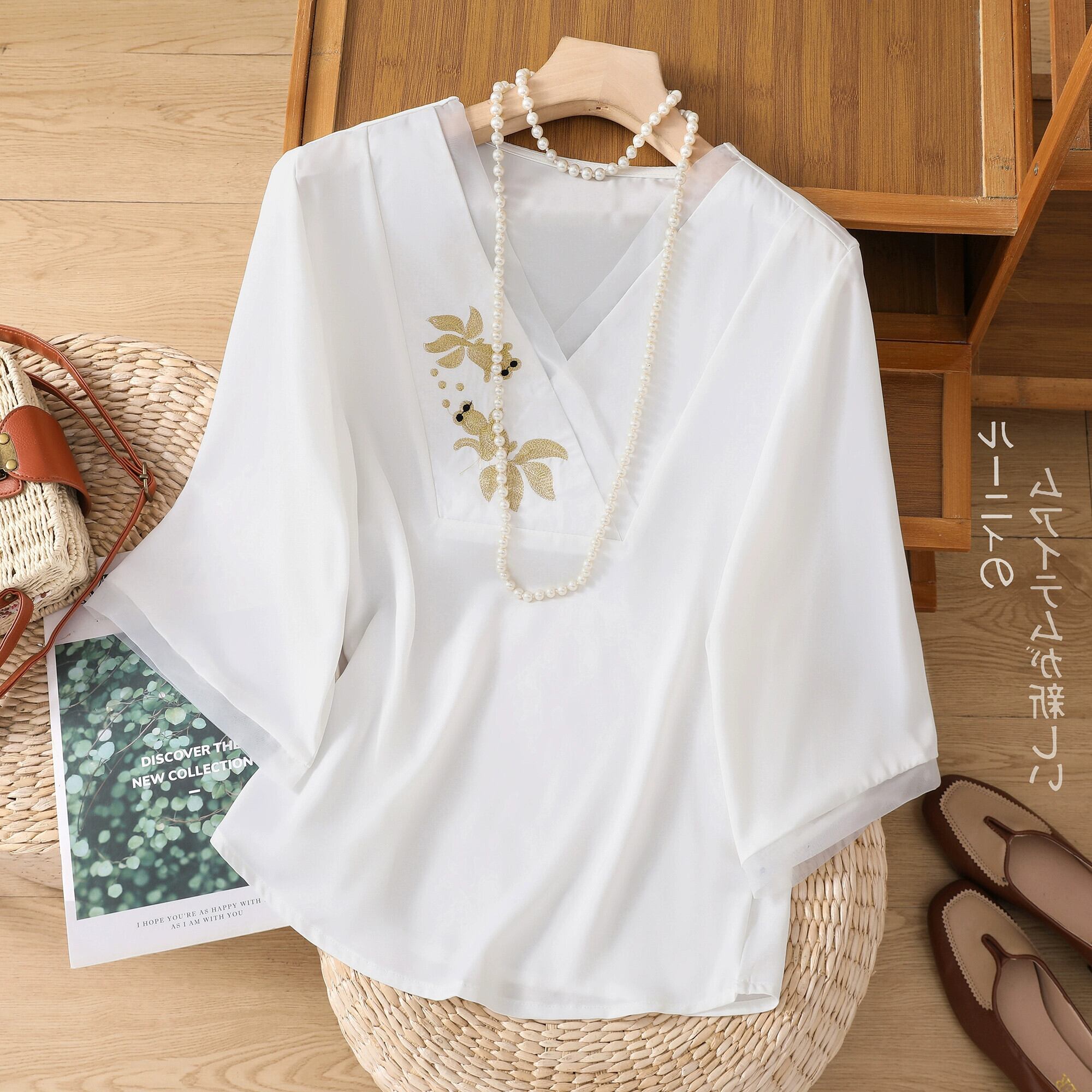 ディスカウントストアショッピングモール中国風刺繍禅トップ女性の夏ルーズカジュアル V ネック半袖シャツ レッド サマー 夏物 Vネック sine50542681714