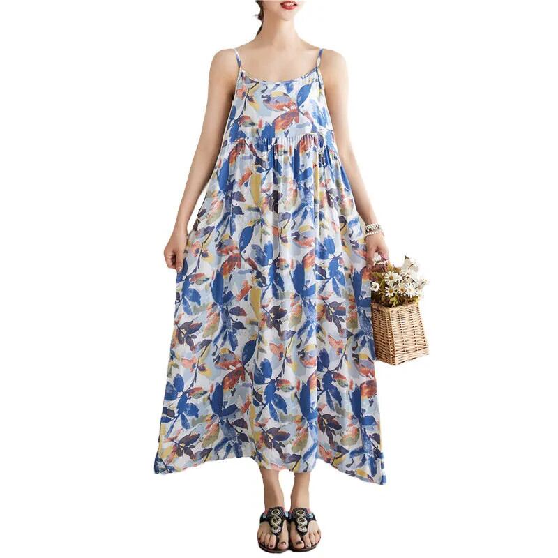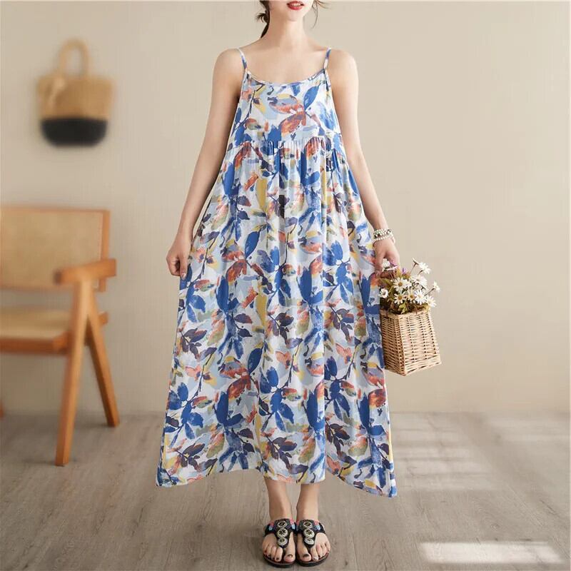 ディスカウントストアショッピングモールの女性の綿とリネンプリントサスペンダードレス文学ルーズリネンノースリーブベストドレス コットン sine96426341212