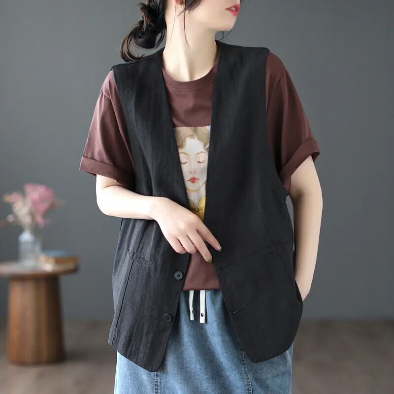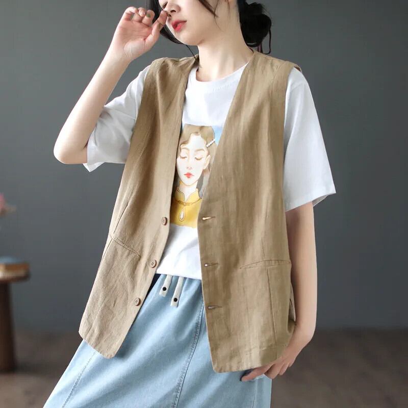 ディスカウントストアモール除去レトロVネックベストベストレディースルーズ薄手リネンノースリーブトップ sine81217111021