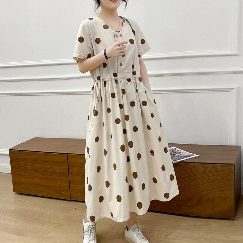 クリアランス クリアランス カウンター 牛グッズ 撤去 エーゼ風水玉純綿ドレス ゆったりウエスト 半袖 Aライン ロングスカート コットン ピュア sine98761213772