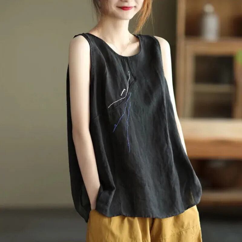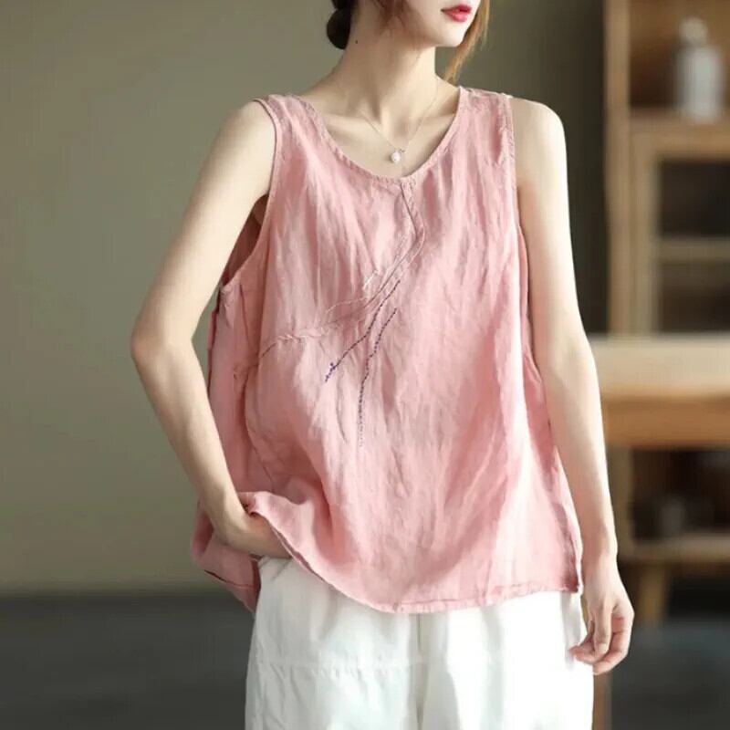 クリアランスカウンター最後の在庫レトロ刺繍コットンとリネンのキャミソールレディースルーズリネンノースリーブトップ薄手 レッド sine18237031206