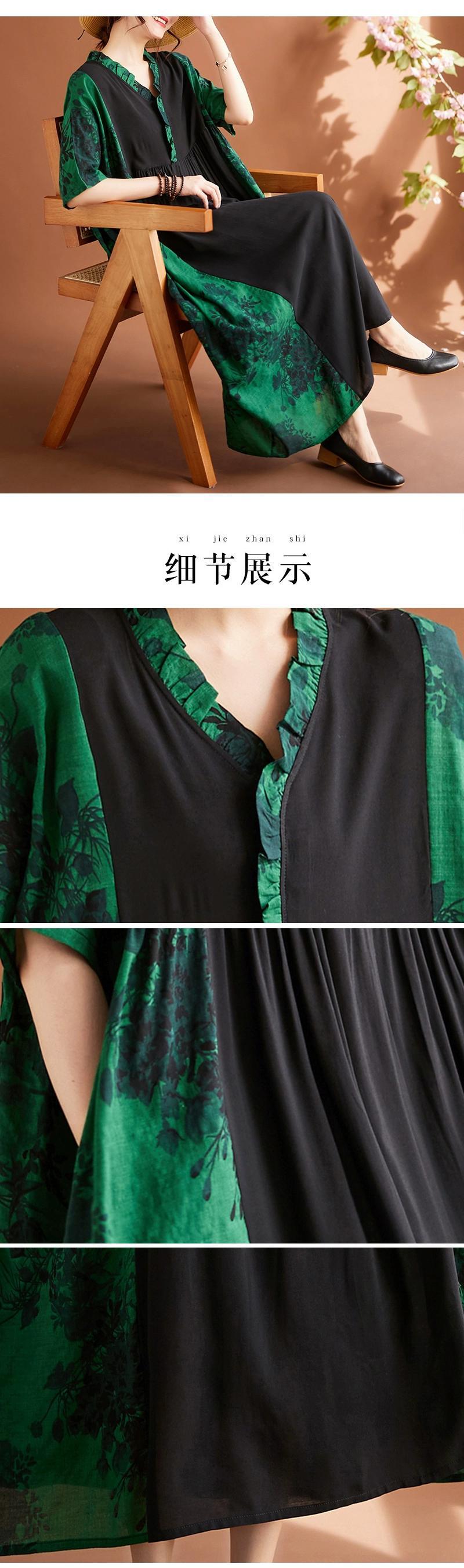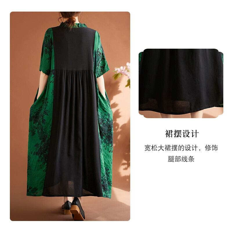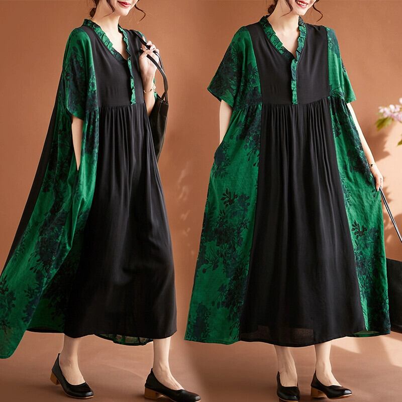 クリアランス漏れ〜カウンターからの、レトロなスプライシングプリントのコットンとリネンのドレス、大きな裾のゆったりとした大きいサイズのVネックリネンスカート。 大きめサイズ sine35815880252