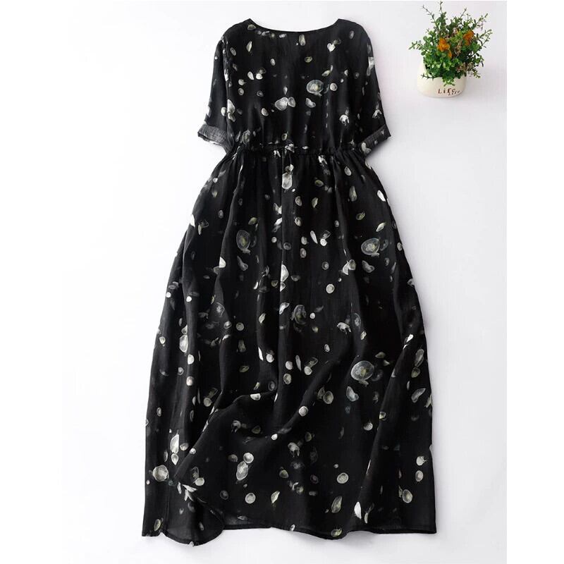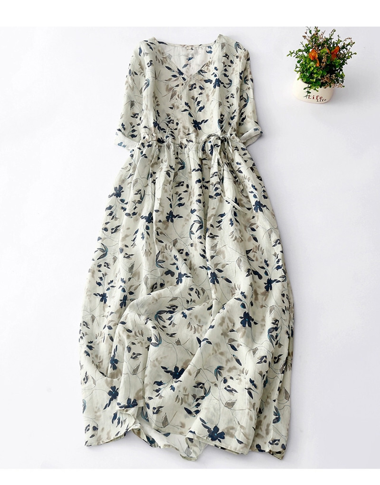 女性用ラミープリントドレス、ウエストタイ、Vネック、ワイドヘムリネンドレス sine21843918427